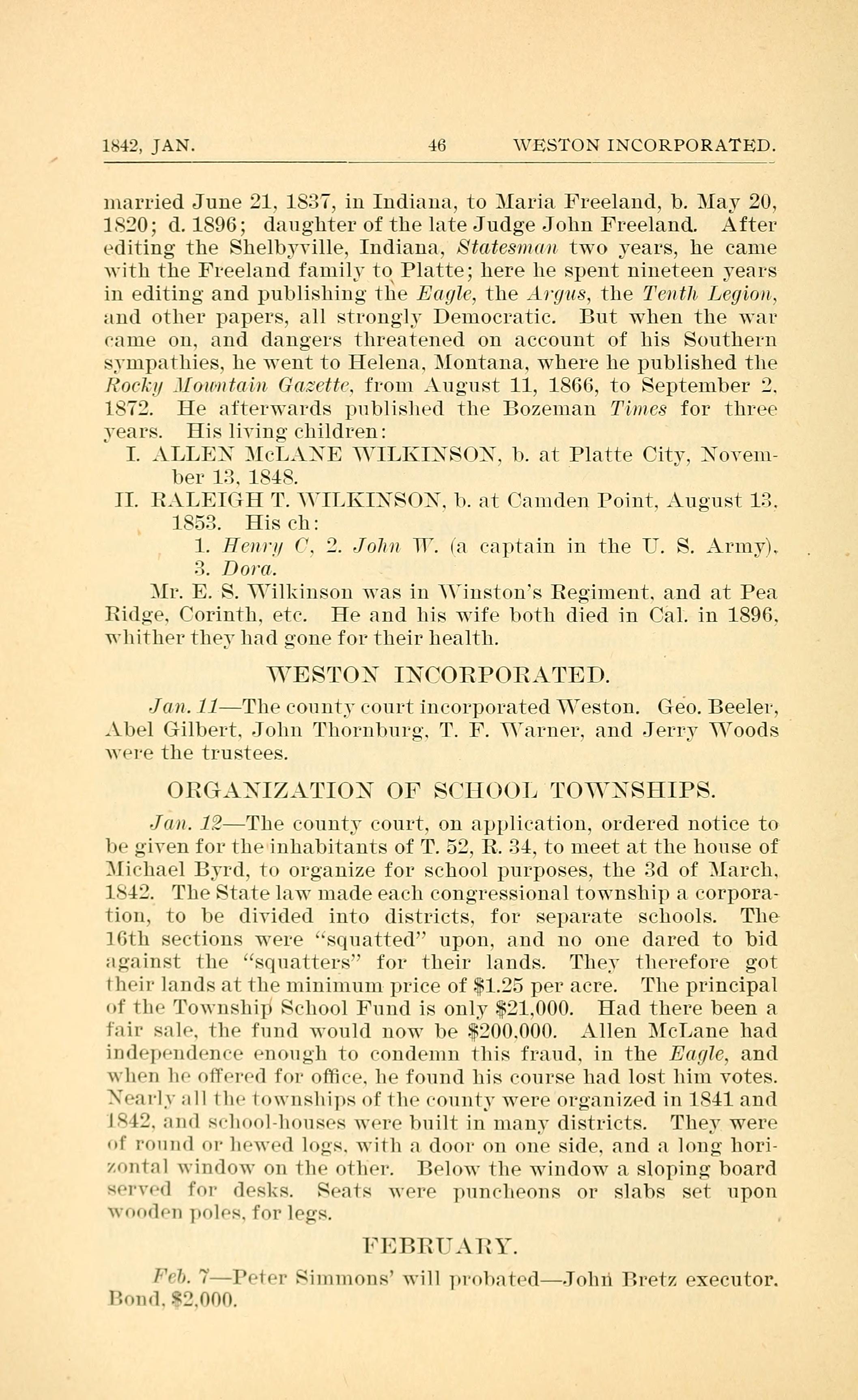 Jan. 11 The county court incorporated Weston. Geo. Beeler, Abel Gilbert. John Thornburg. T. F. Warner and Jerry Woods were the trustees.