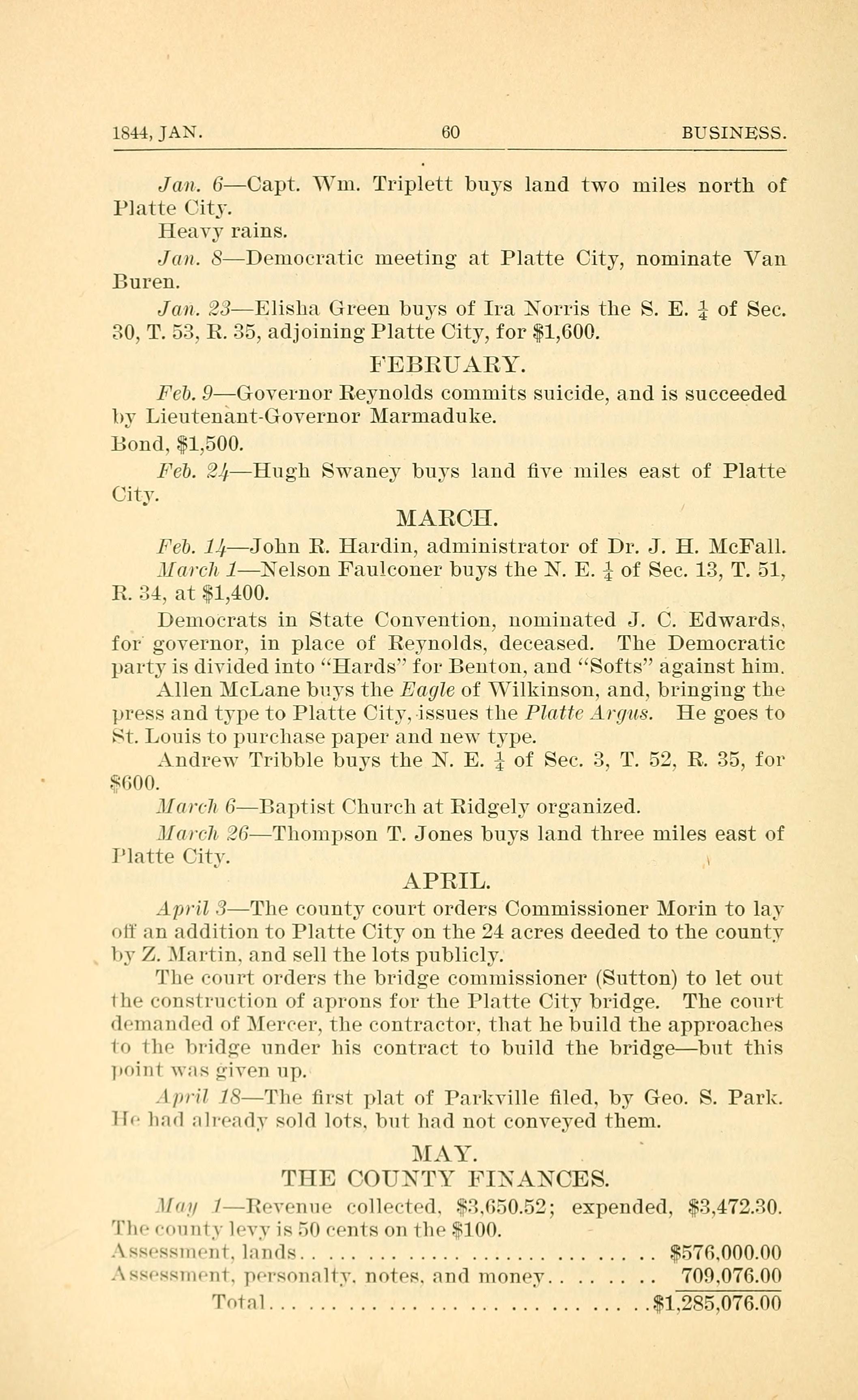 Jan. 6 - Capt. William Triplett buys land two miles north of Platte City.