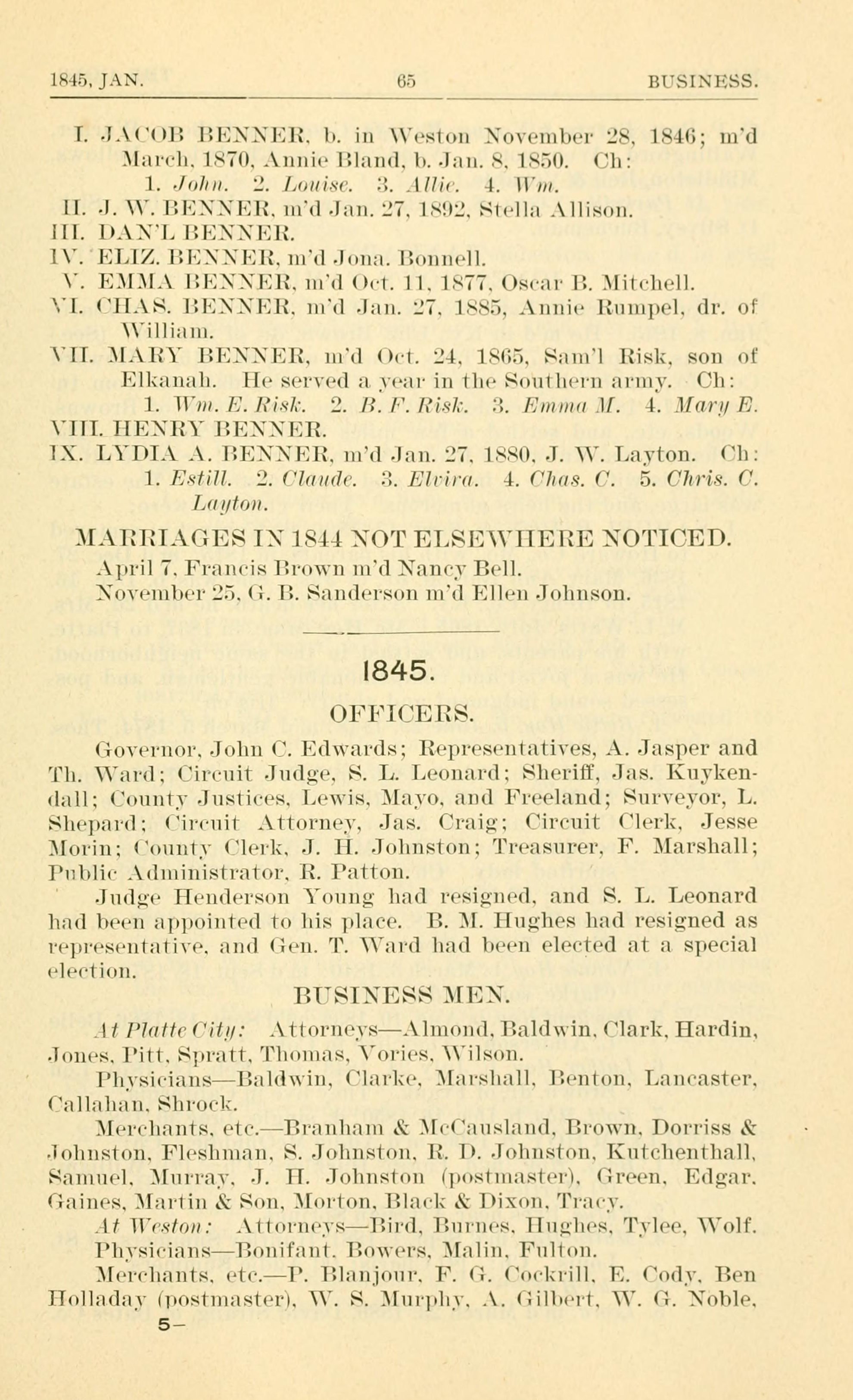 Governor, John C. Edwards; Representatives, A. Jasper and Th. Ward; Circuit Judge, S. L. Leonard; Sheriff, James Kuykendall; County Justices, Lewis, Mayo, and Freeland; Surveyor, L. Shepard; Circuit Attorney, James Craig; Circuit Clerk, Jesse Morin; County Clerk, J. H. Johnson; Treasurer, F. Marshall; Public Administrator, R. Patton.