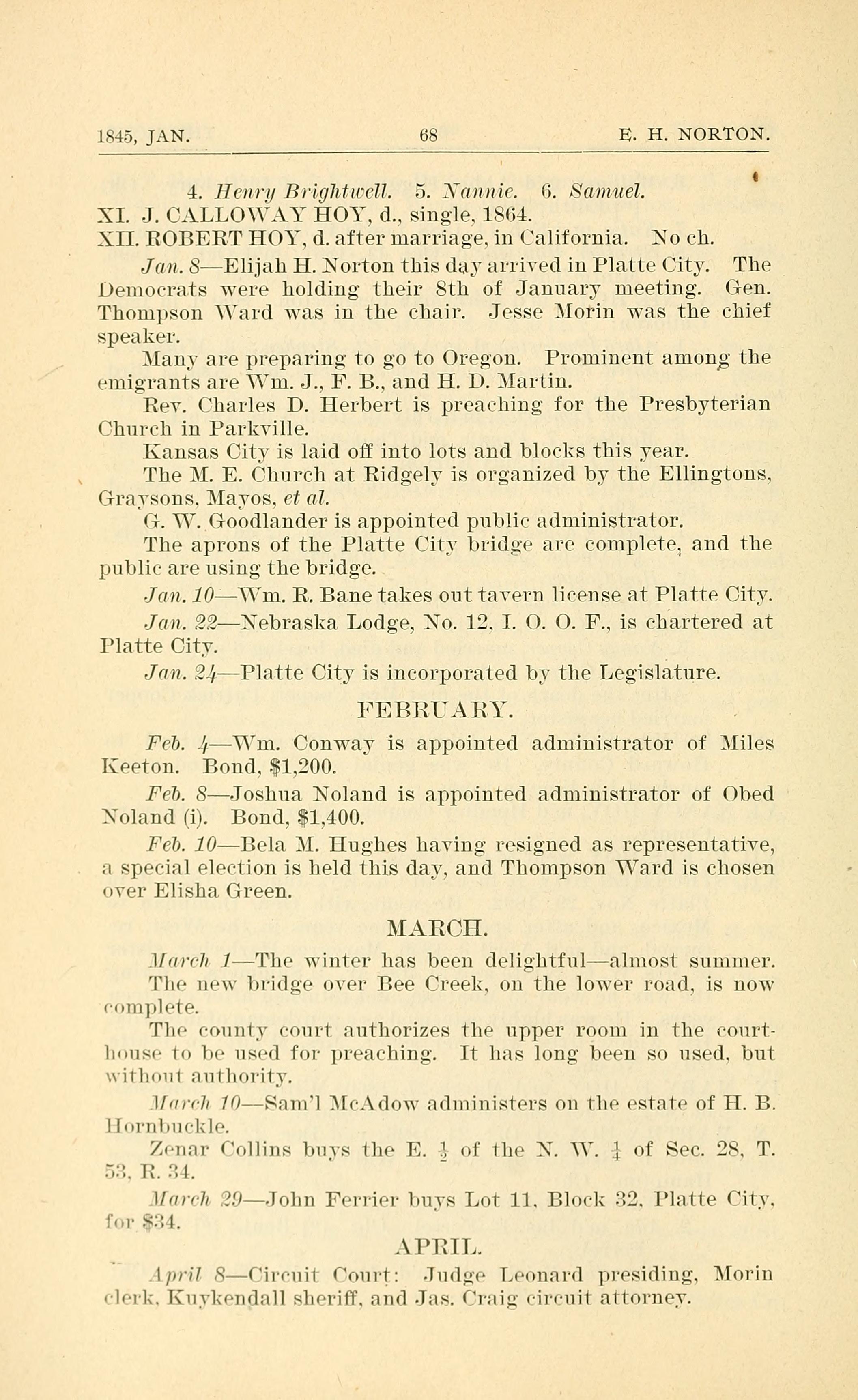 Jan. 8 - Elijah H. Norton this day arrived in Platte City. The