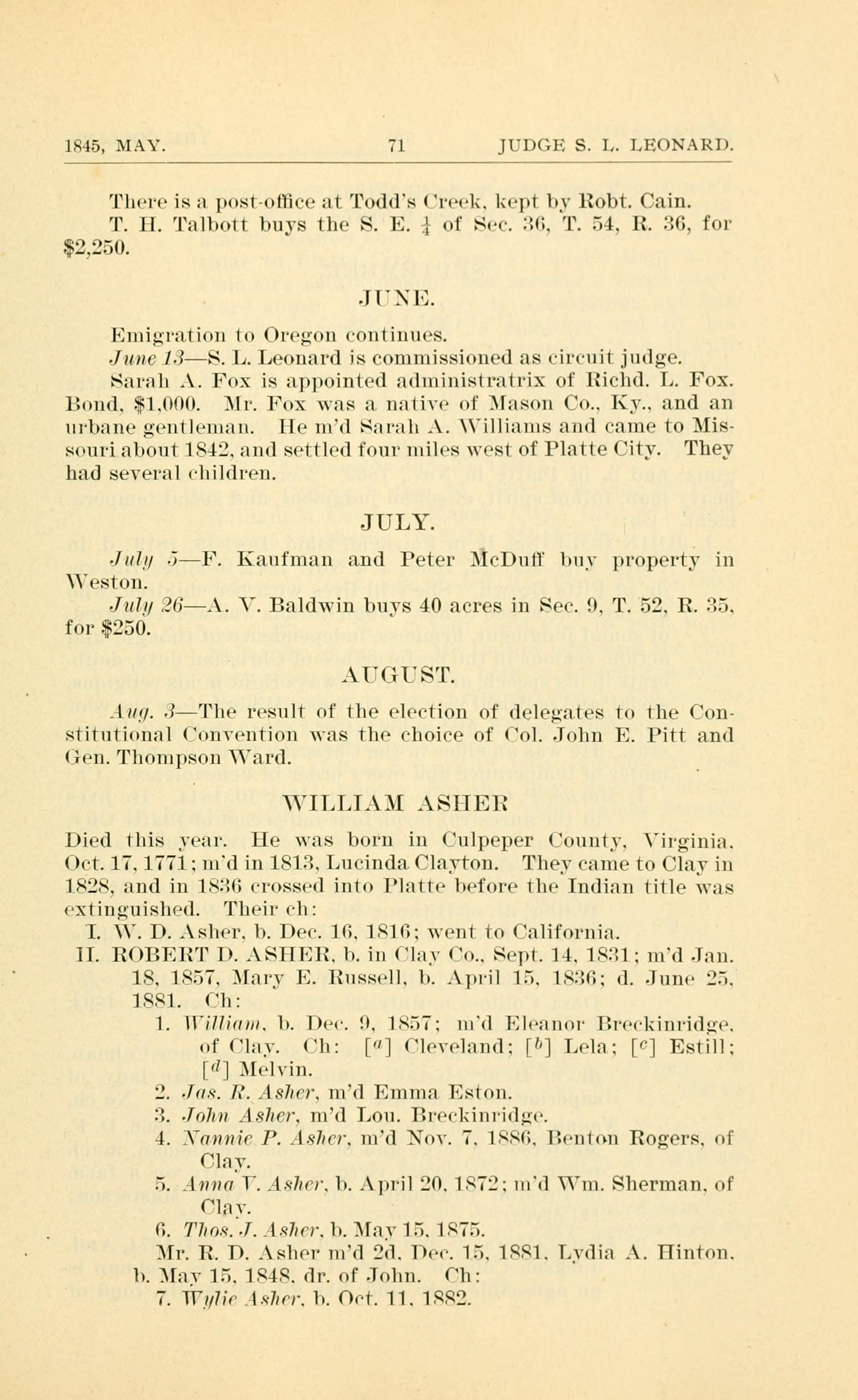 II. ROBERT D. ASHER, b. in Clay County, Sept. 14, 1831; married Jan. 18, 1857, Mary E. Russell, b. April 15, 1836; d. June 25, 1881. Children: