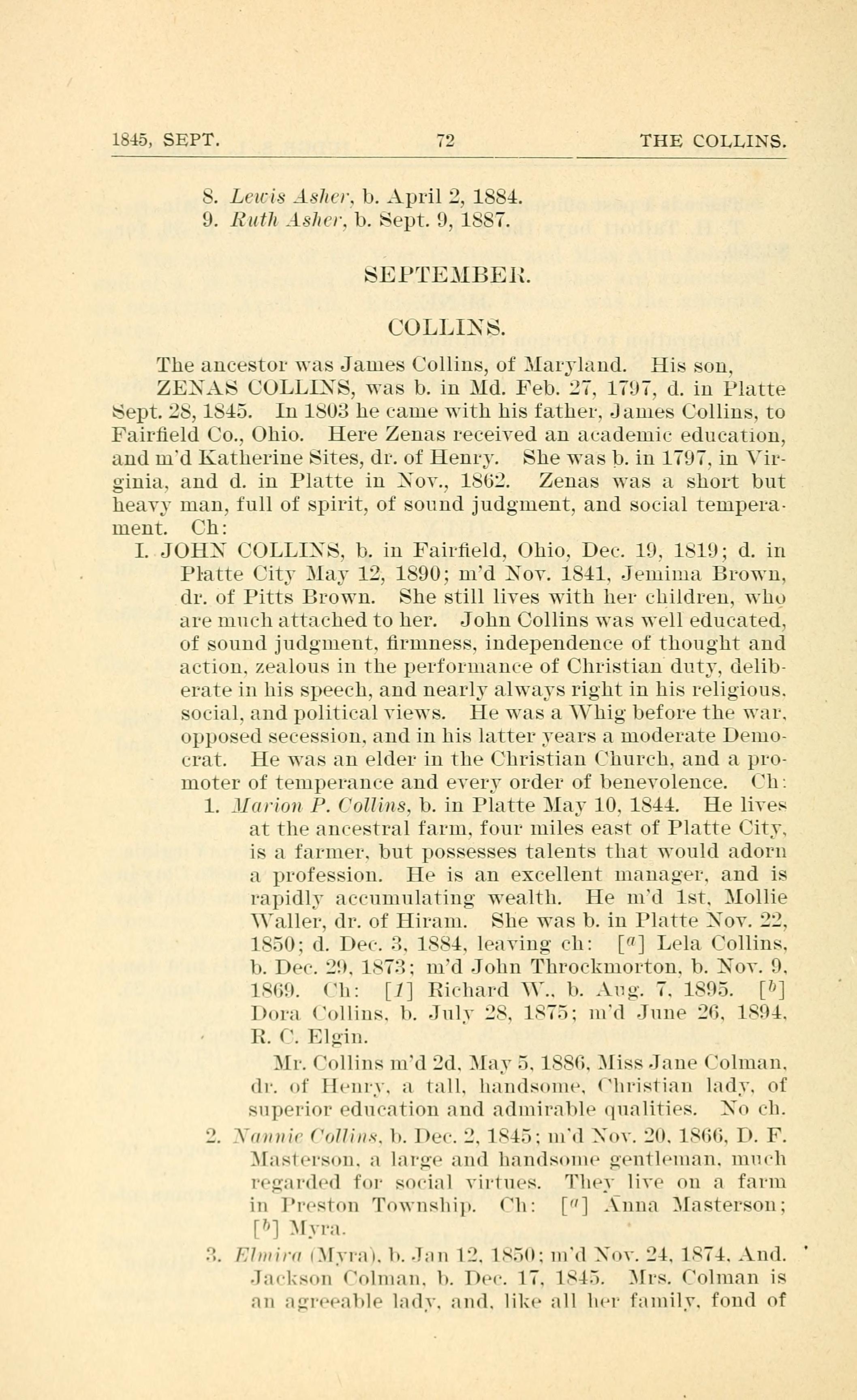 ZENAS COLLINS, was b. in Md. Feb. 27, 1797, d. in Platte