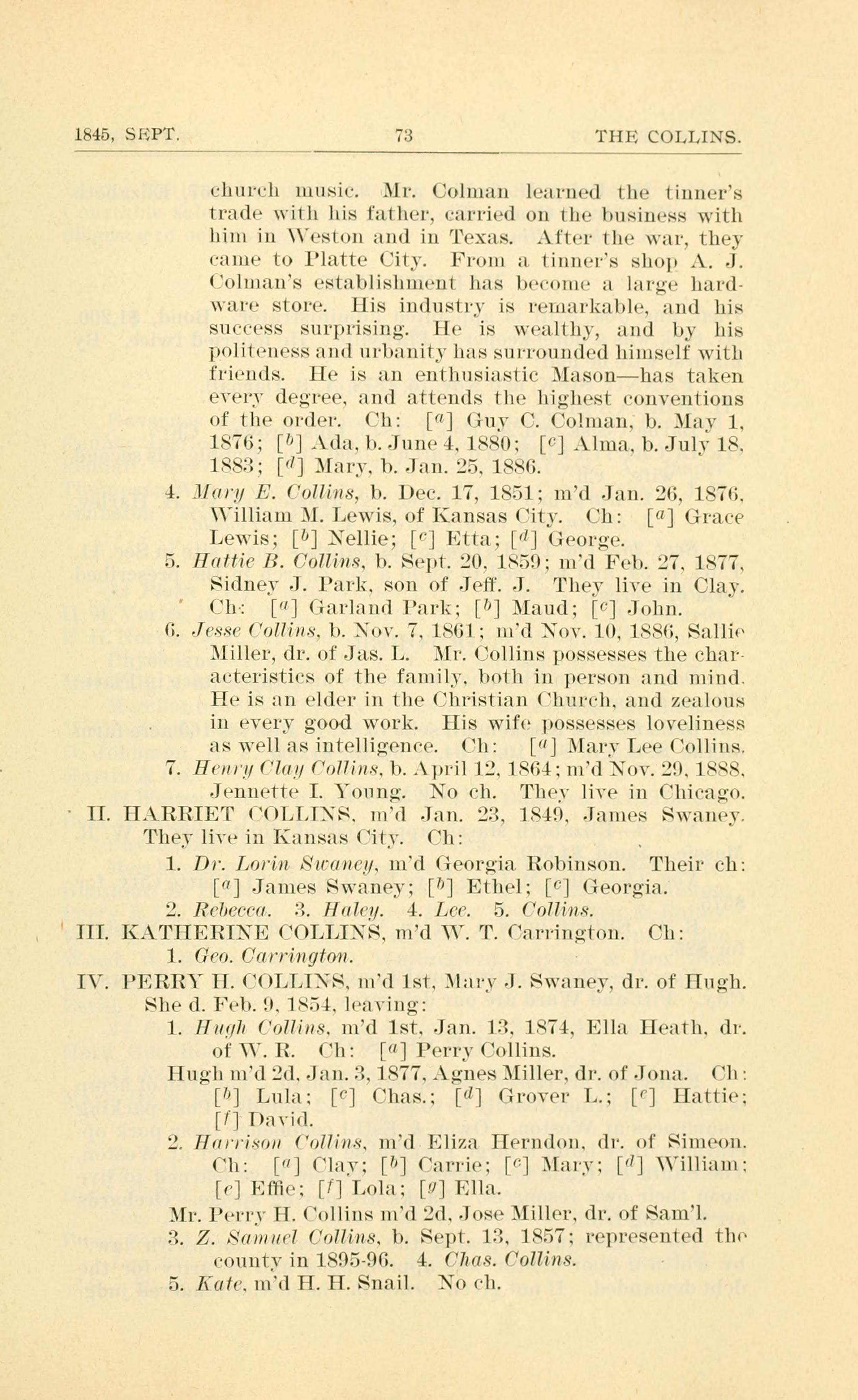 IV. PERRY H. C()I.l.I.S. ni(l 1st. ;lar~ J. Swaney, dr. of Hugh.