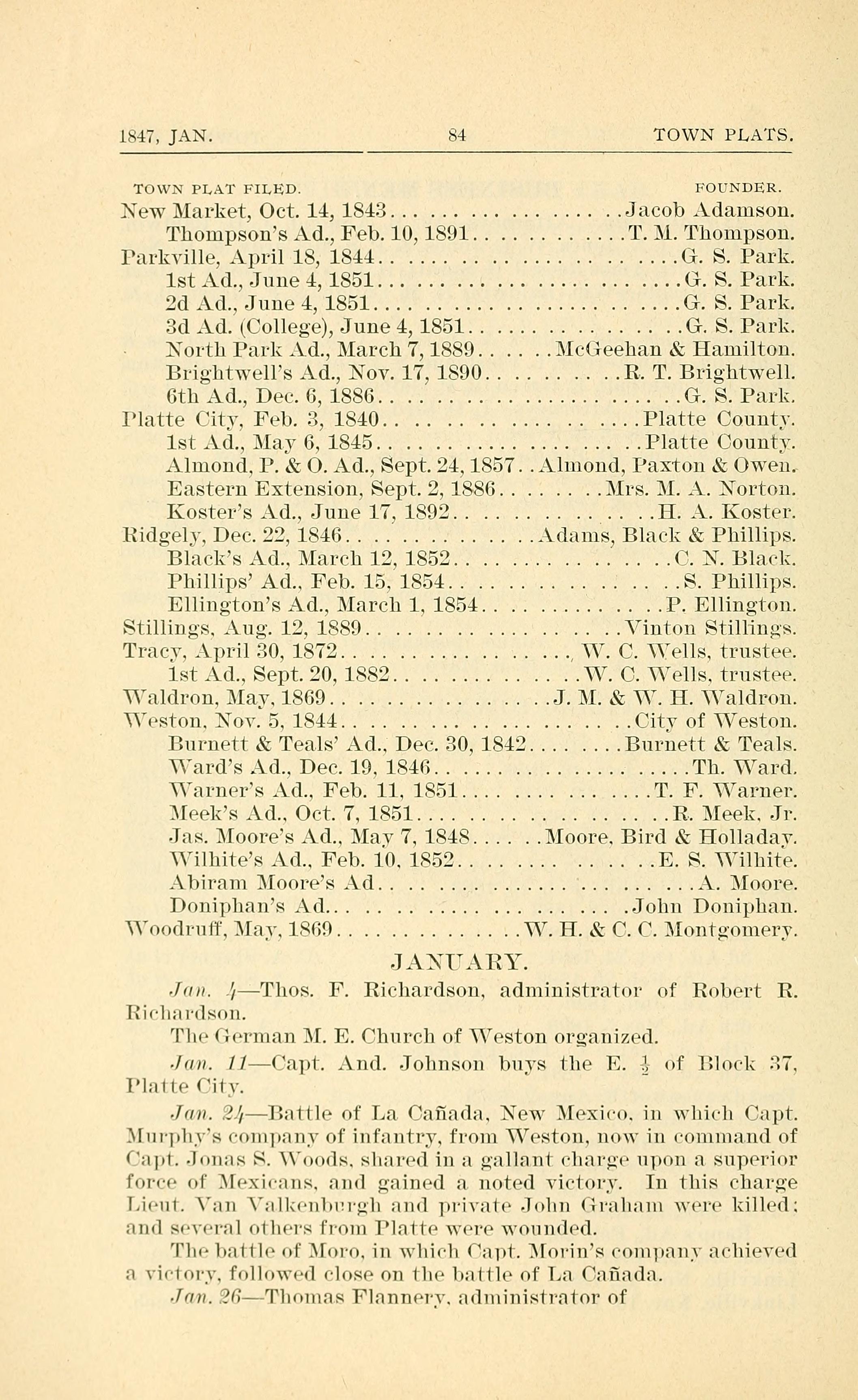 Jan. 11 - Capt And. Johnson buys the E 1/2 of Block 37, Platte City