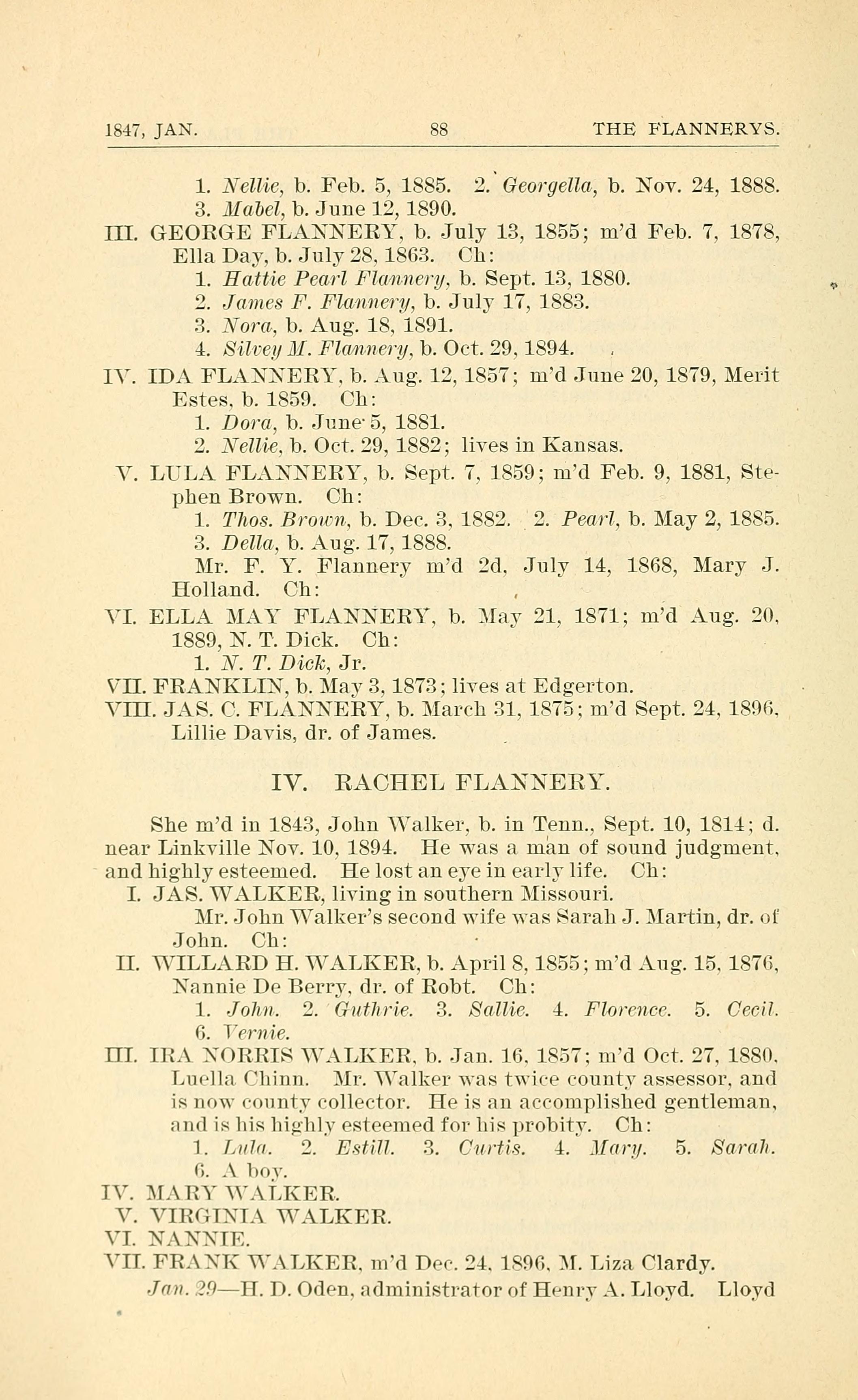 IH. GEORGE FLANNERY, b. July 13, 1855; md Feb. 7, 1878,