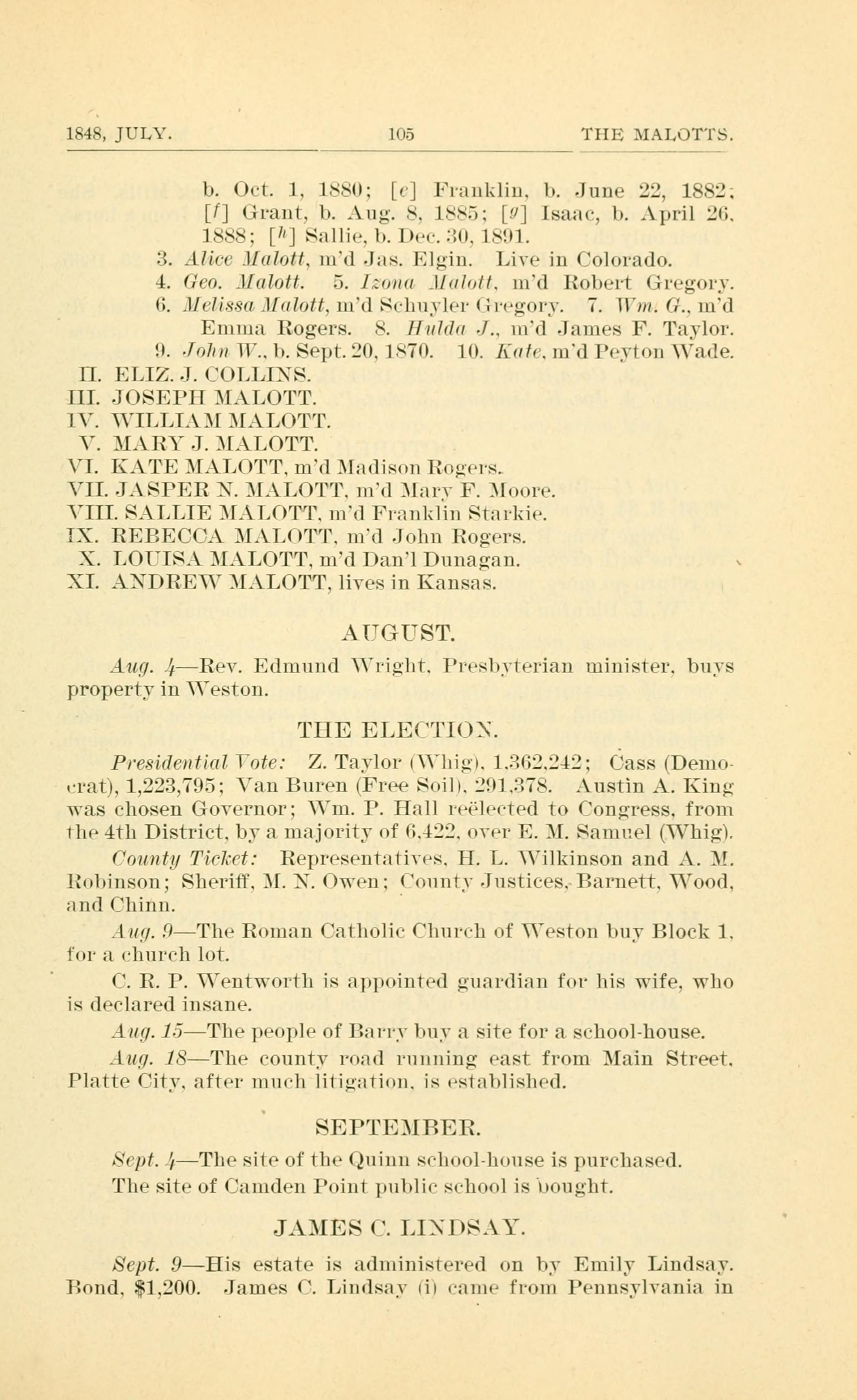 Aug 18 - The county road running east from Main Street. Platte City, after much litigation, is established.