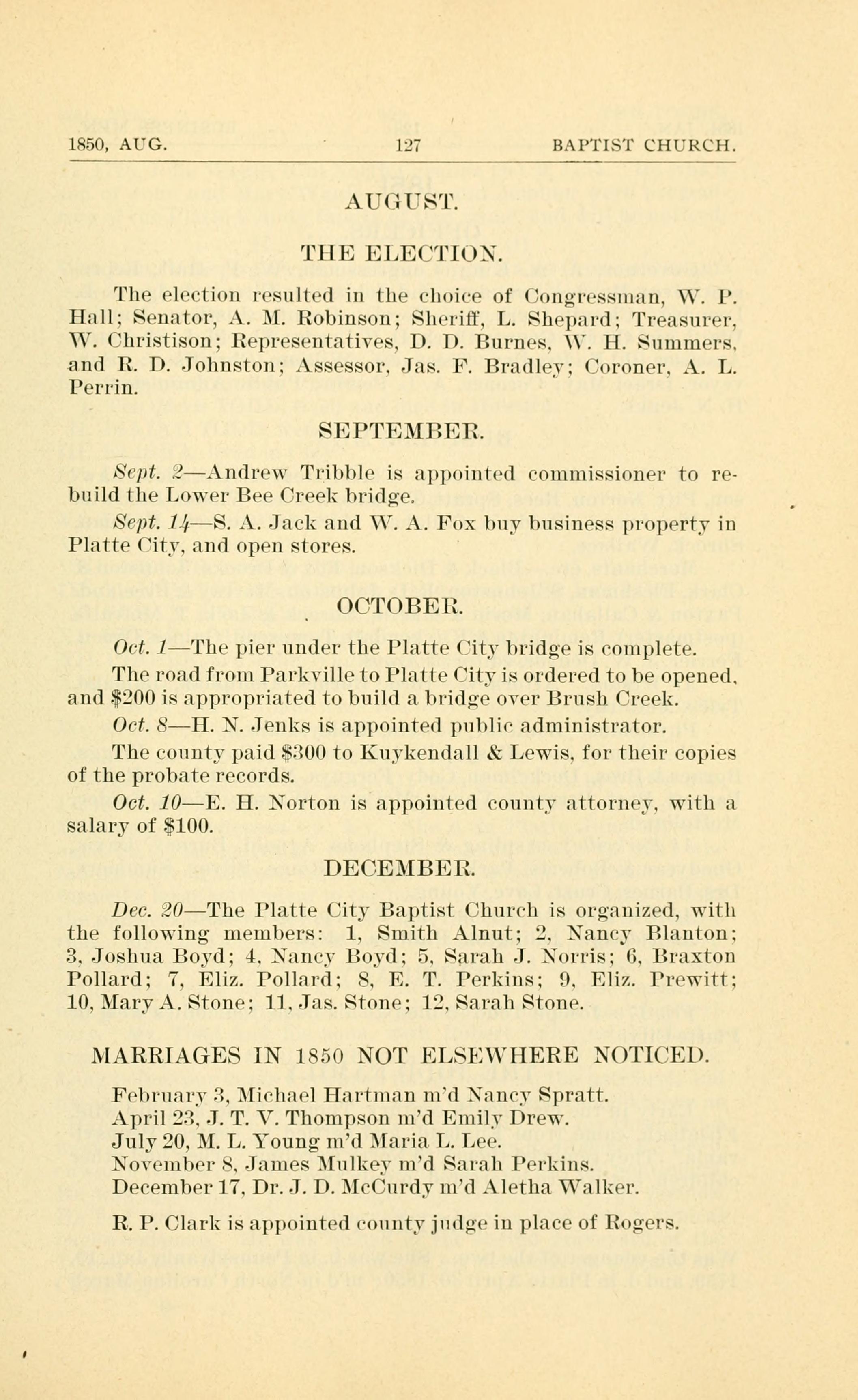 Dec. 20The Platte City Baptist Church is organized, with