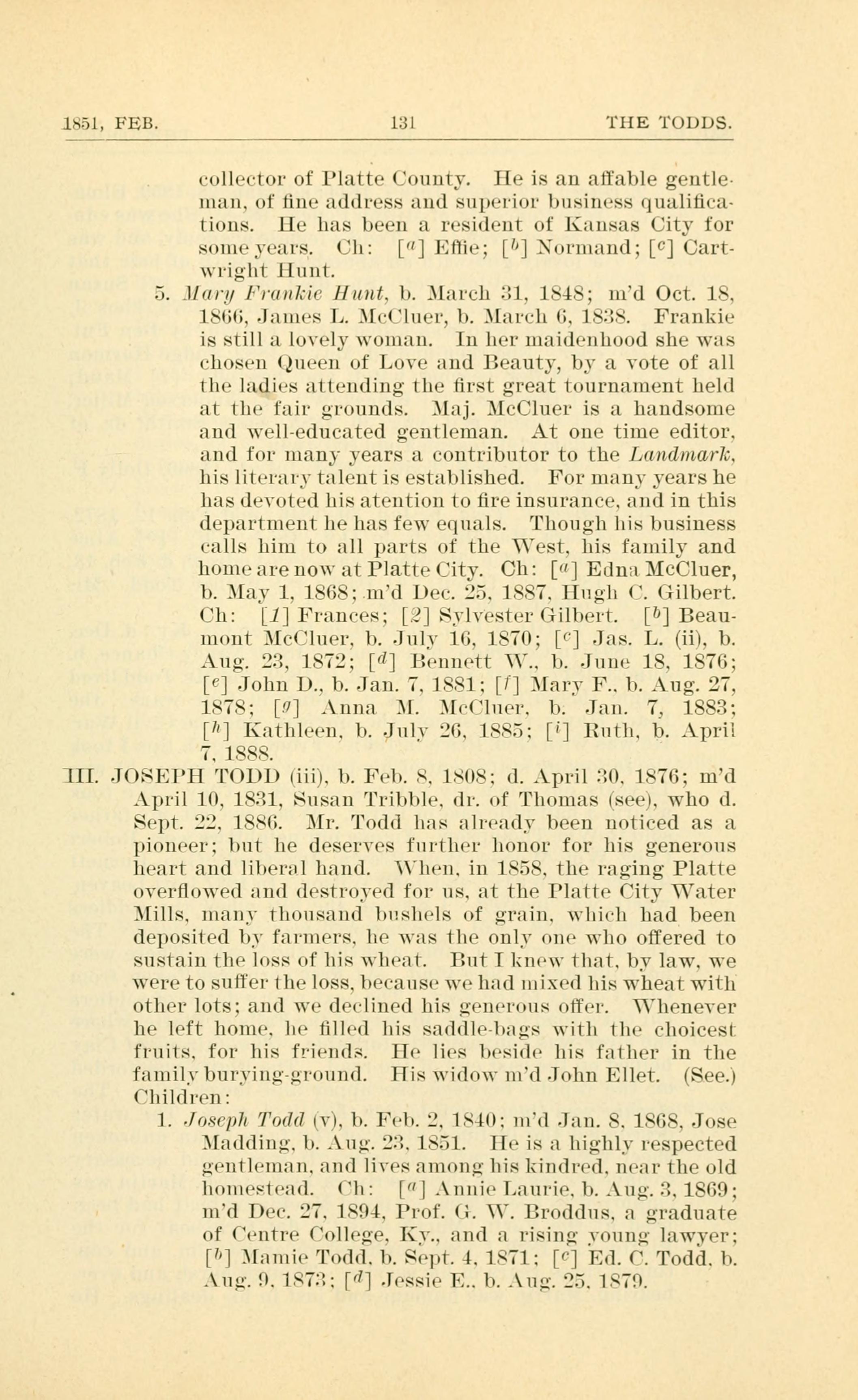 1. Joseph Todd (V). b. Feb. 2. 1840: md Jan. 8. 1.968. Jose