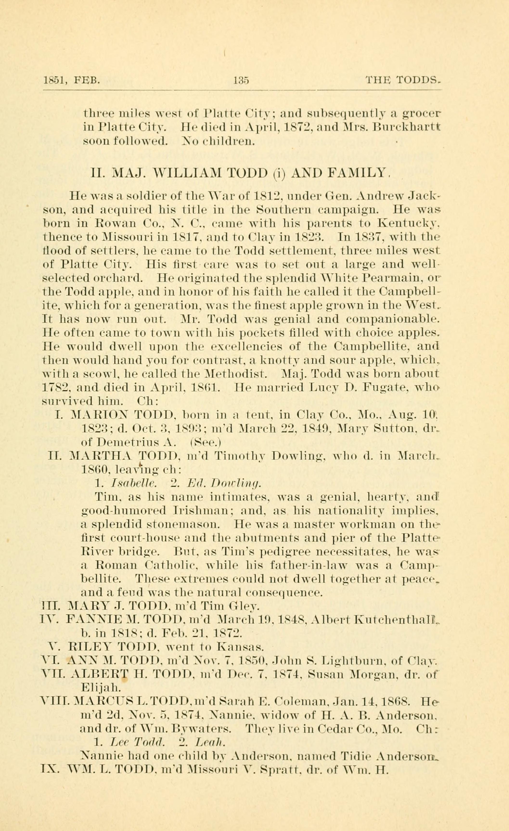 He was a soldier of the War of 1812, under Gen. Andrew Jackson, and aquired his title in the Southern campaign. He was born in Rowan Co., NC., came with his parents to Kentucky, thence to Missouri in 1817, and to Clay in 1823. In 1837, with the flood of settlers, he came to the Todd settlement, three miles west of Platte City. His first care was to set out a large and well-selected orchard. He originated the splendid White Pearmain, or the Todd apple, and in honor of his faith he called it the Campbellite, which for a generation, was the finest apple grown in the West. It has now run out. Mr. Todd was genial and companionable. He often came to town with his pockets filled with choice apples. He would dwell upon the excellencies of the Campbellite, and then would have you for contrast, a knotty and sour apple, which , with a scowl, he call the Methodist. Maj. Todd was born about 1782, and died in April 1861. He married Lucy D. Fugate, who survived him. Children: