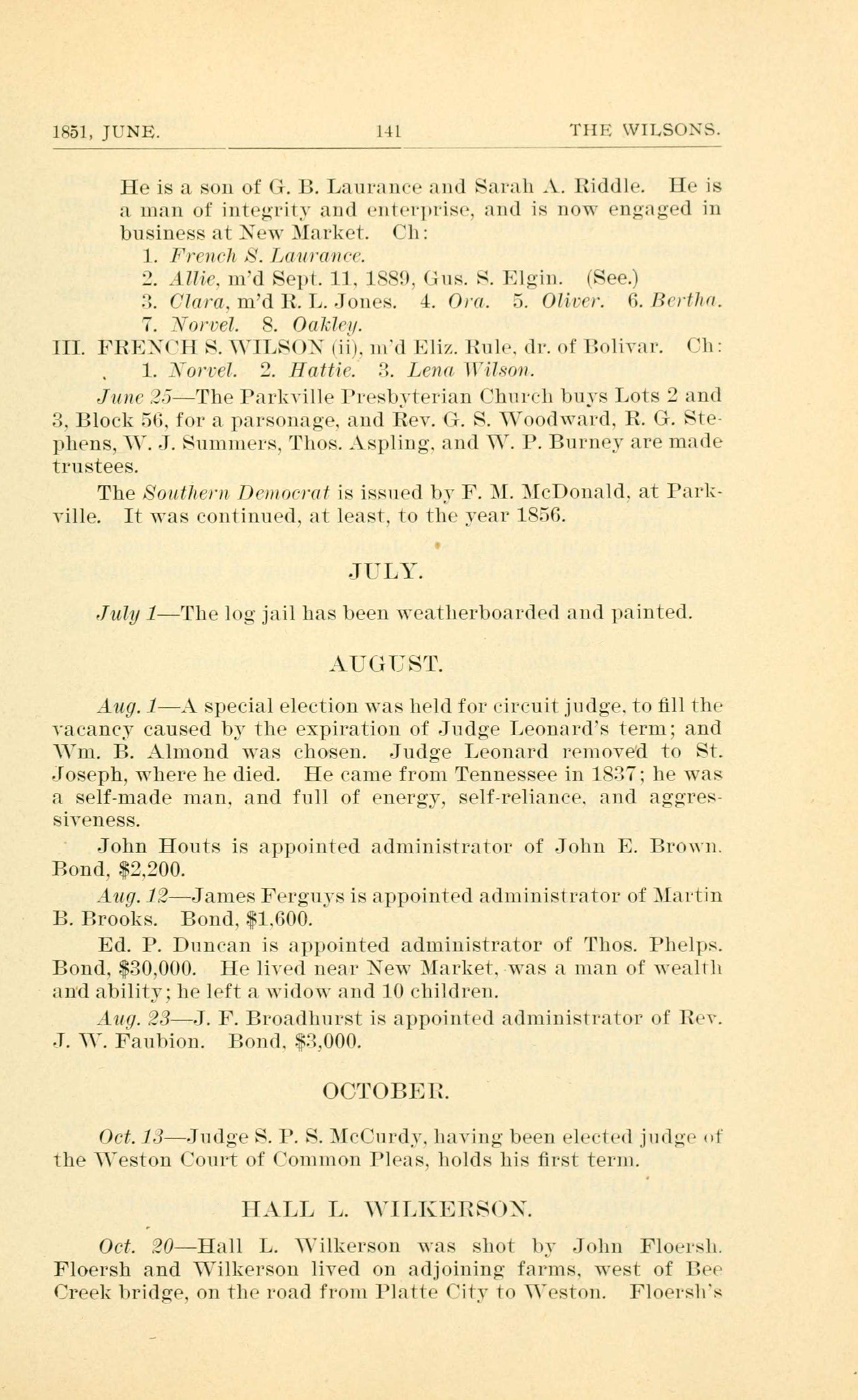 Oct 20 - Hall L. Wilkerson was shot by John Floersh. Floersh and Wilkerson lived on adjoining farms, west of Bee Creek bridge, on the road from Platte City to Weston. Floersh's