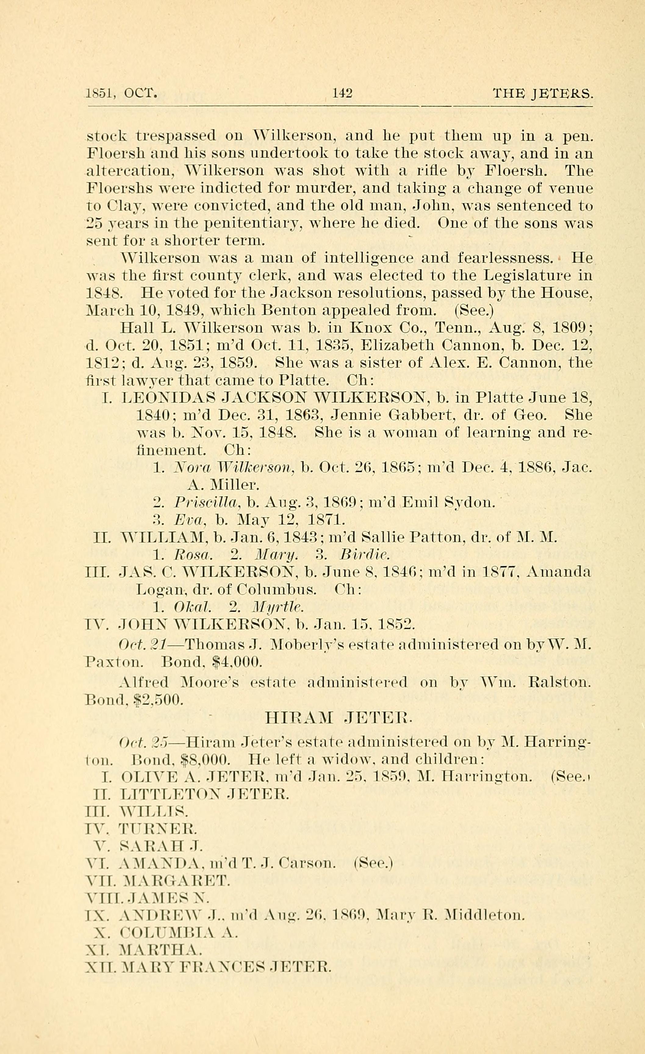 Hall L. Wilkerson was born in Knox County, Tennessee, Aug. 8, 1809; d. Oct. 20, 1851; married Oct. 11, 1835, Elizabeth Cannon, b. Dec. 12, 1812; d. Aug. 23, 1859. She was a sister of Alex. E. Cannon, the first lawyer that came to Platte.