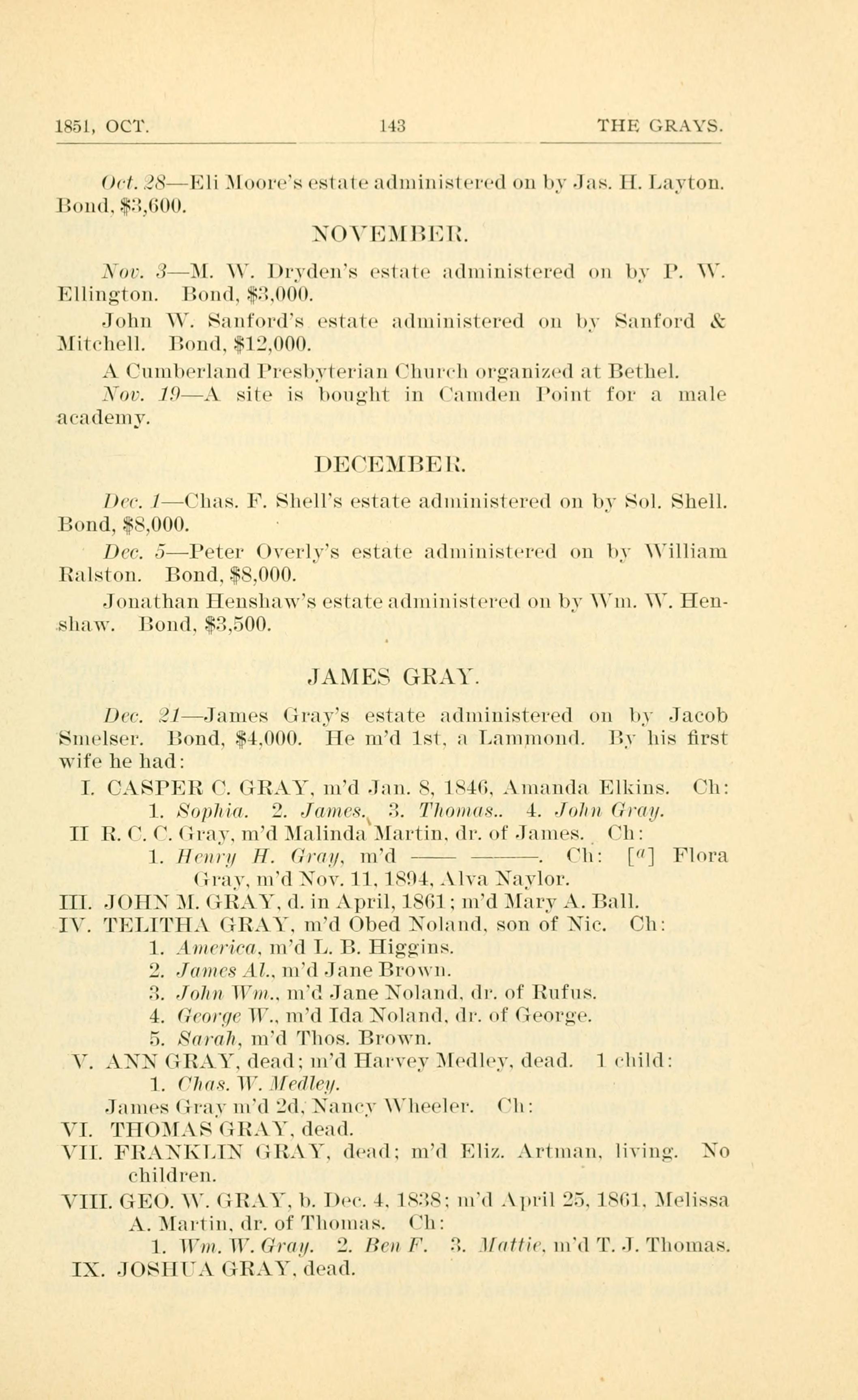 Dec. 21 - James Gray's estate administered on by Jacob Smelser. Bond, $4,000. He married 1st, a Lammond. By his first wife he had: