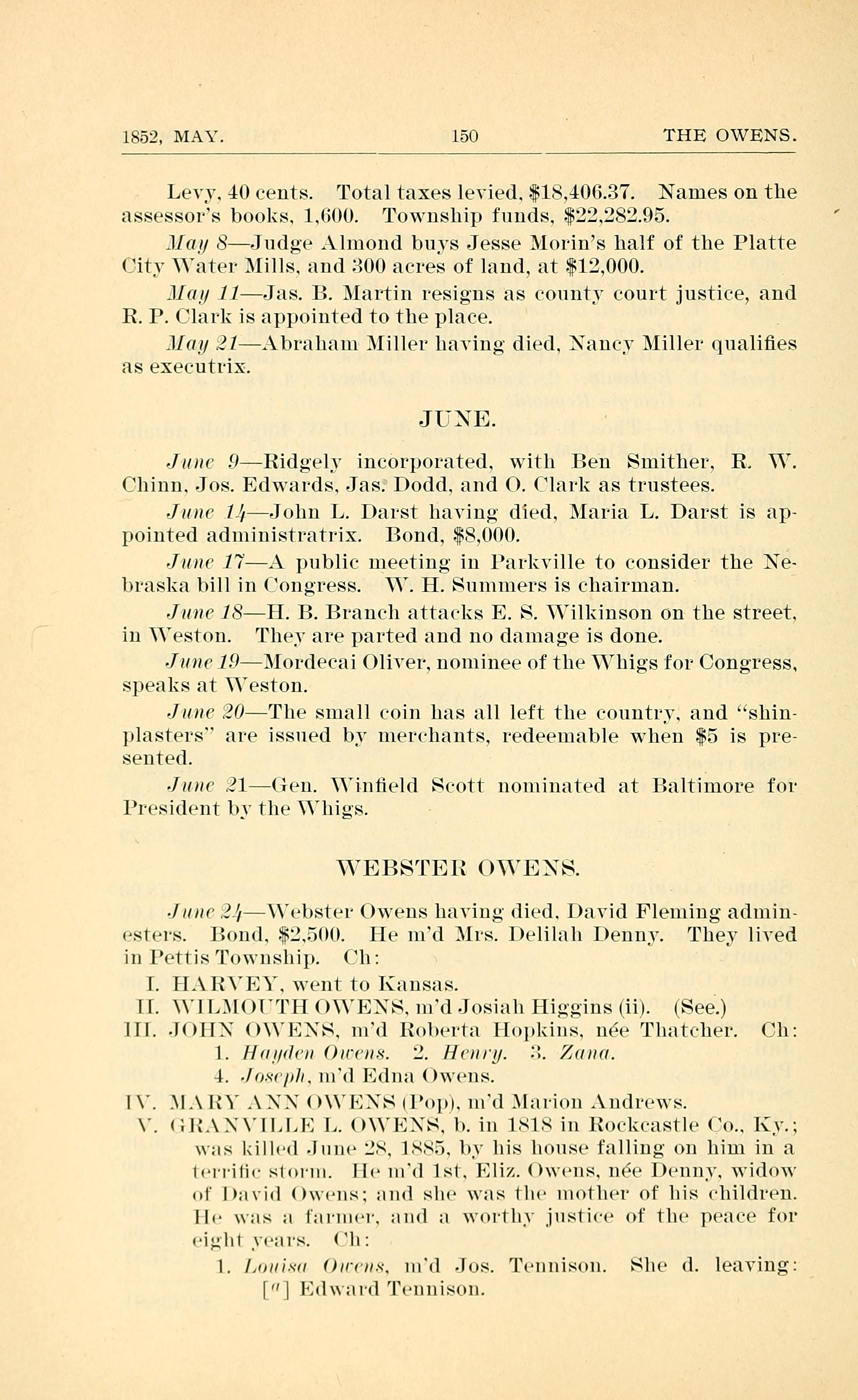 June 24 - Webster Owens having died, David Fleming administers. Bond, $2,500. He married Mrs. Delilah Denny. They lived in Pettis Township.