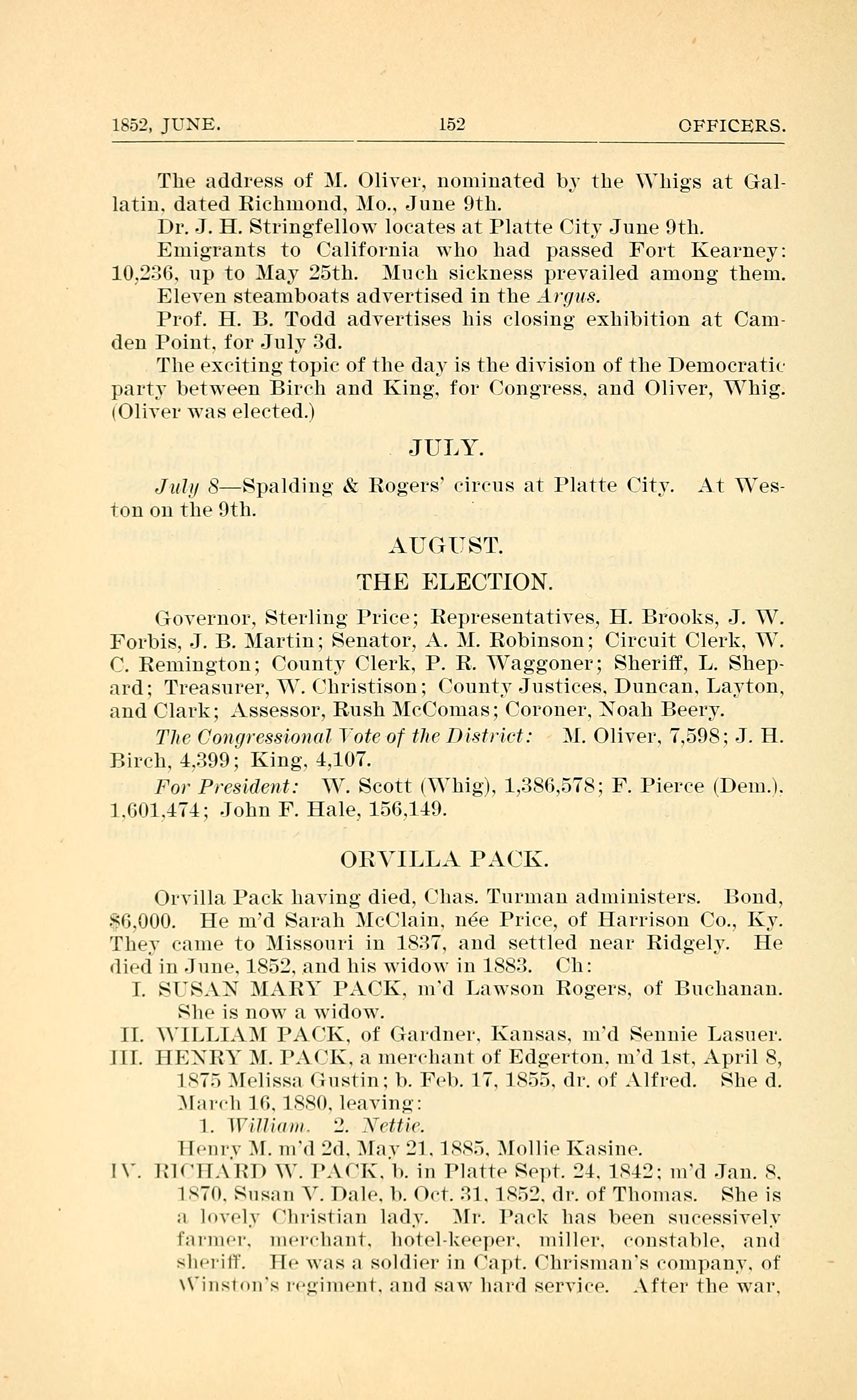 July 8Spalding & Rogers circus at Platte City. At Wes-
