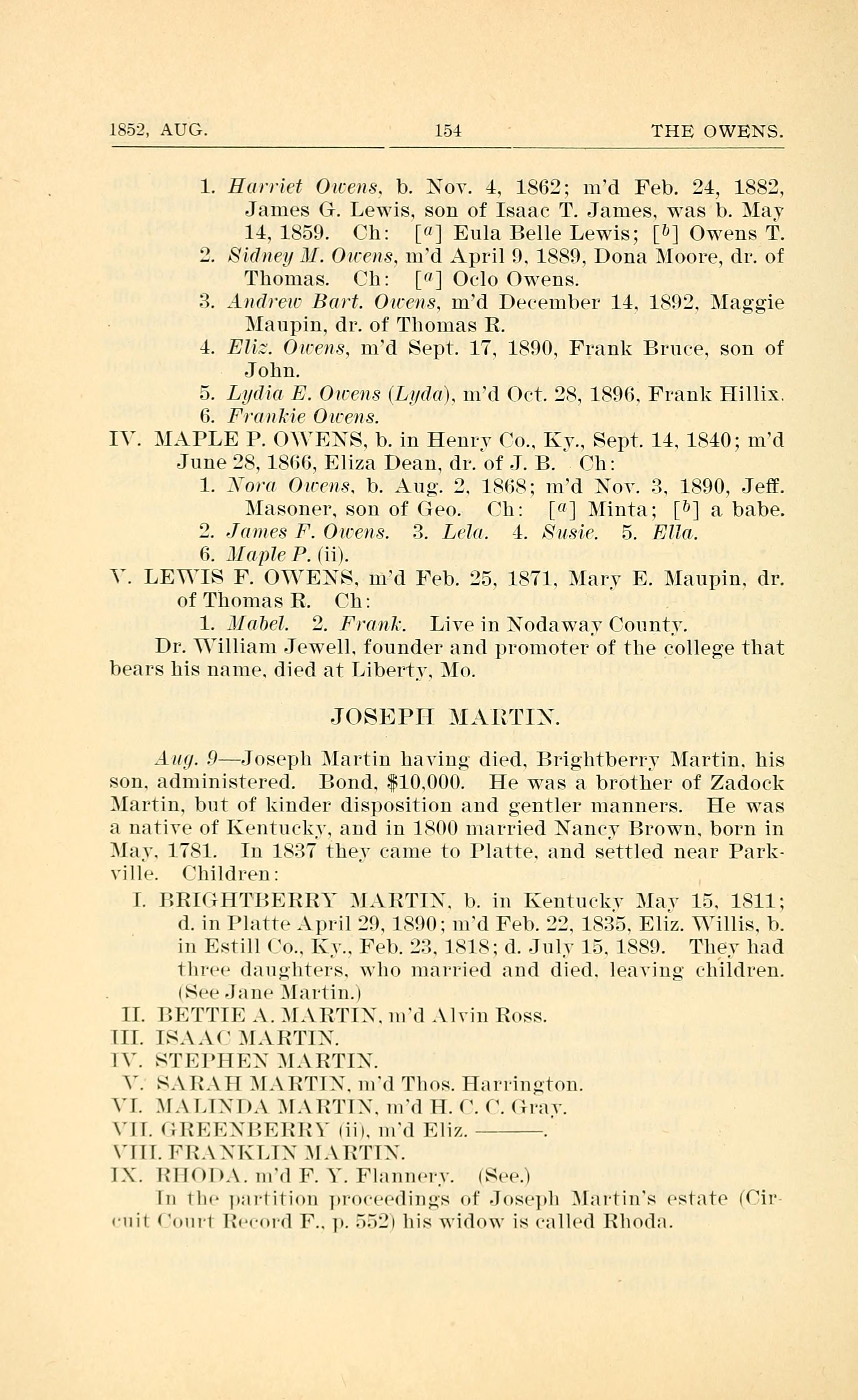 14,1859. Children: [0] Eula Belle Lewis; [D] Owens T.