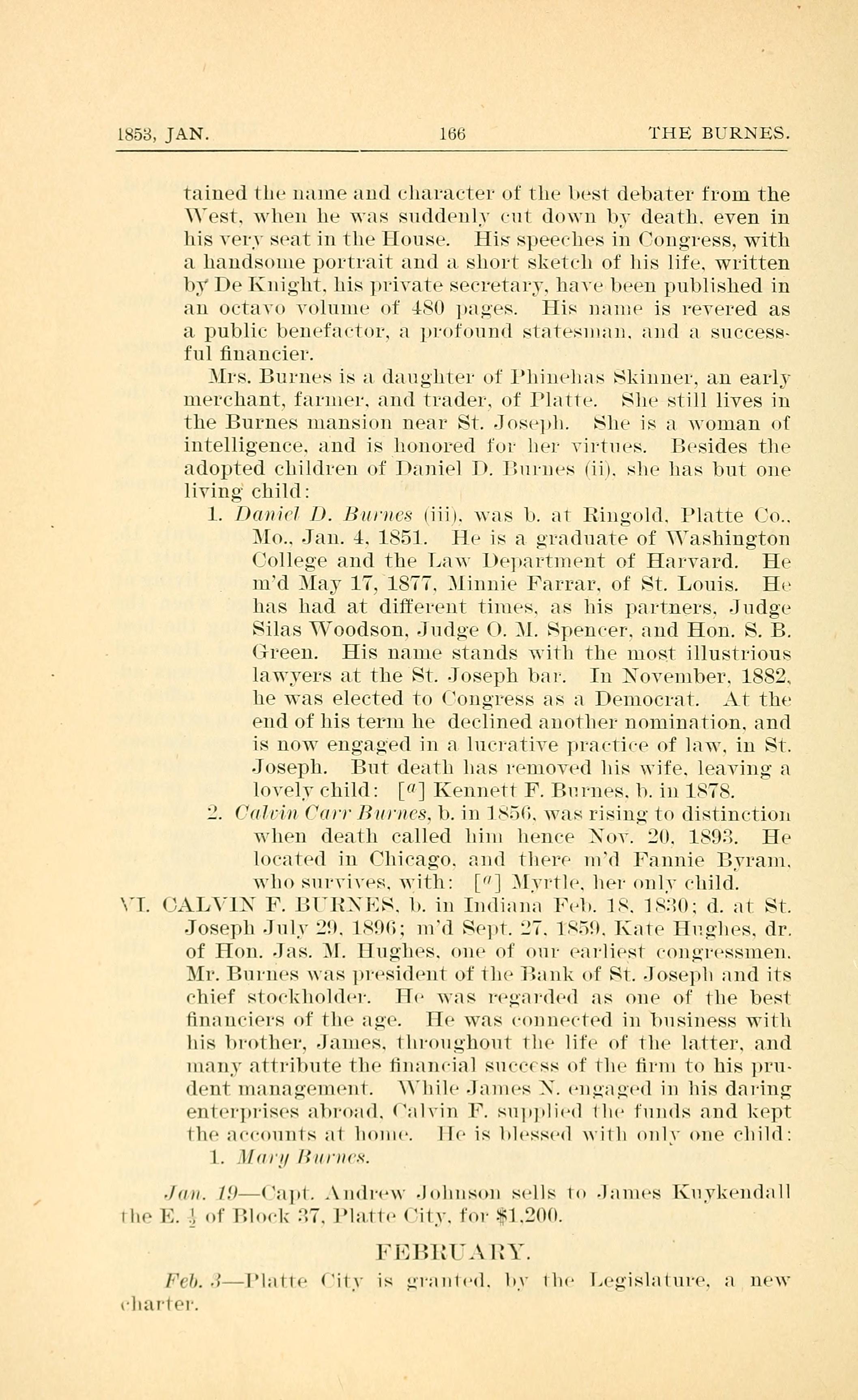 1. Daniel D. Burnes (iii), was b. at Ringold. Platte Co..