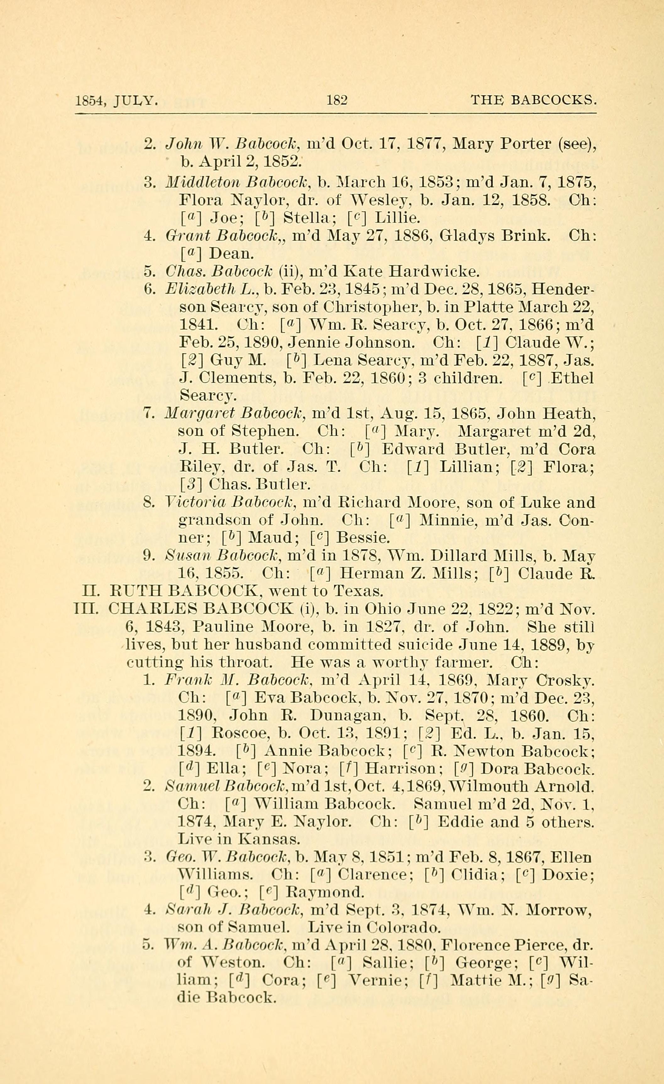 III. CHARLES BABCOCK (i), b. in Ohio June 22. 1822; married Nov. 6, 1843, Pauline Moore, b. in 1827. dr. of John Moore. She still lives, but her husband committed suicide June 14, 1889, by cutting his throat. He was a worthy farmer. Children: