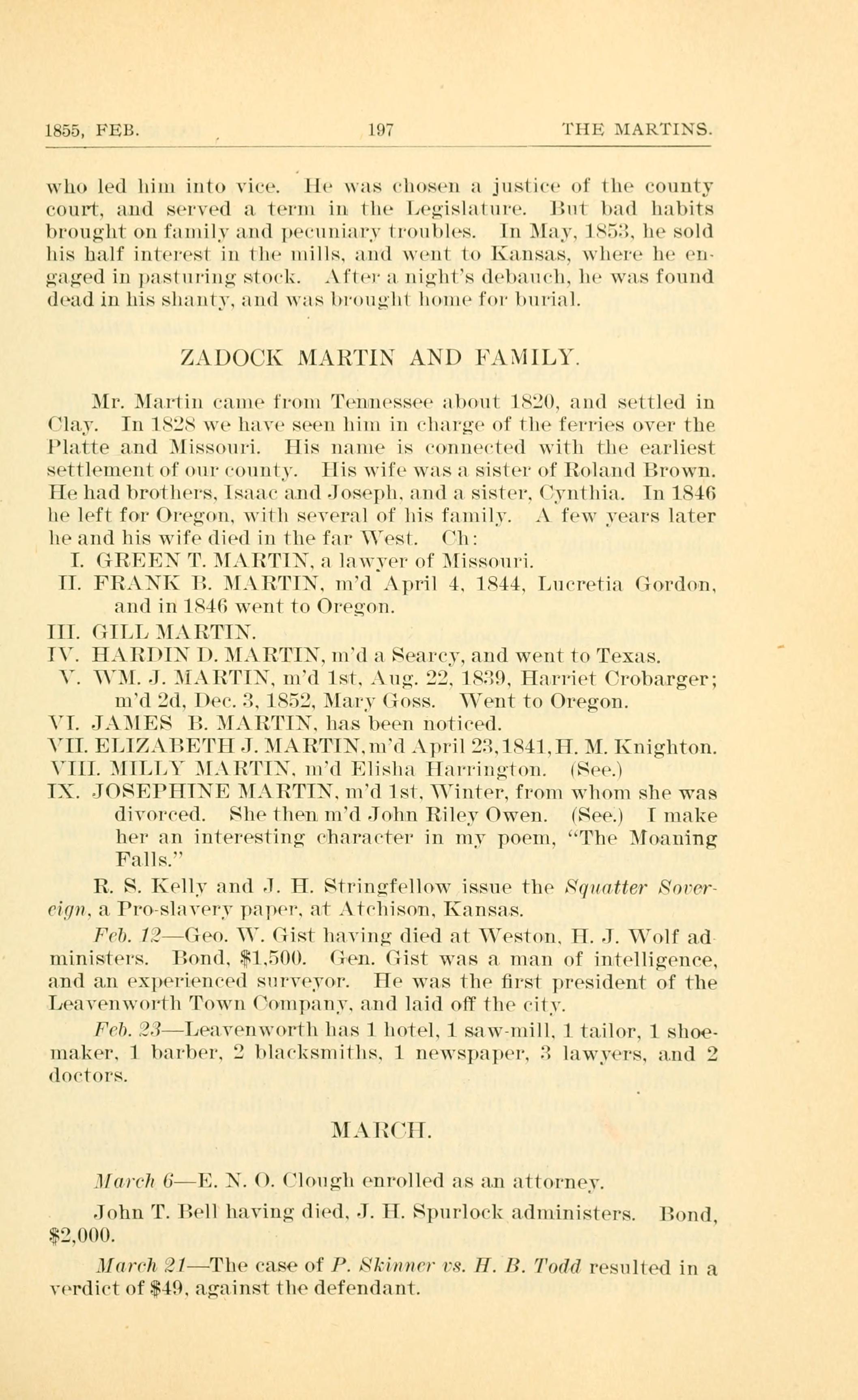 Mr. Martin came from Tennessee about 1820, and settled in Clay. In 1828 we have seen him in charge of the ferries over the Platte and Missouri. His name is connected with the earliest settlement of our country. His wife was a sister of Roland Brown. He had brothers, Isaac and Joseph, and a sister Cynthia. In 1846 he left for Oregon, with several of his family. A few years later he and his wife died in the far West. Children: