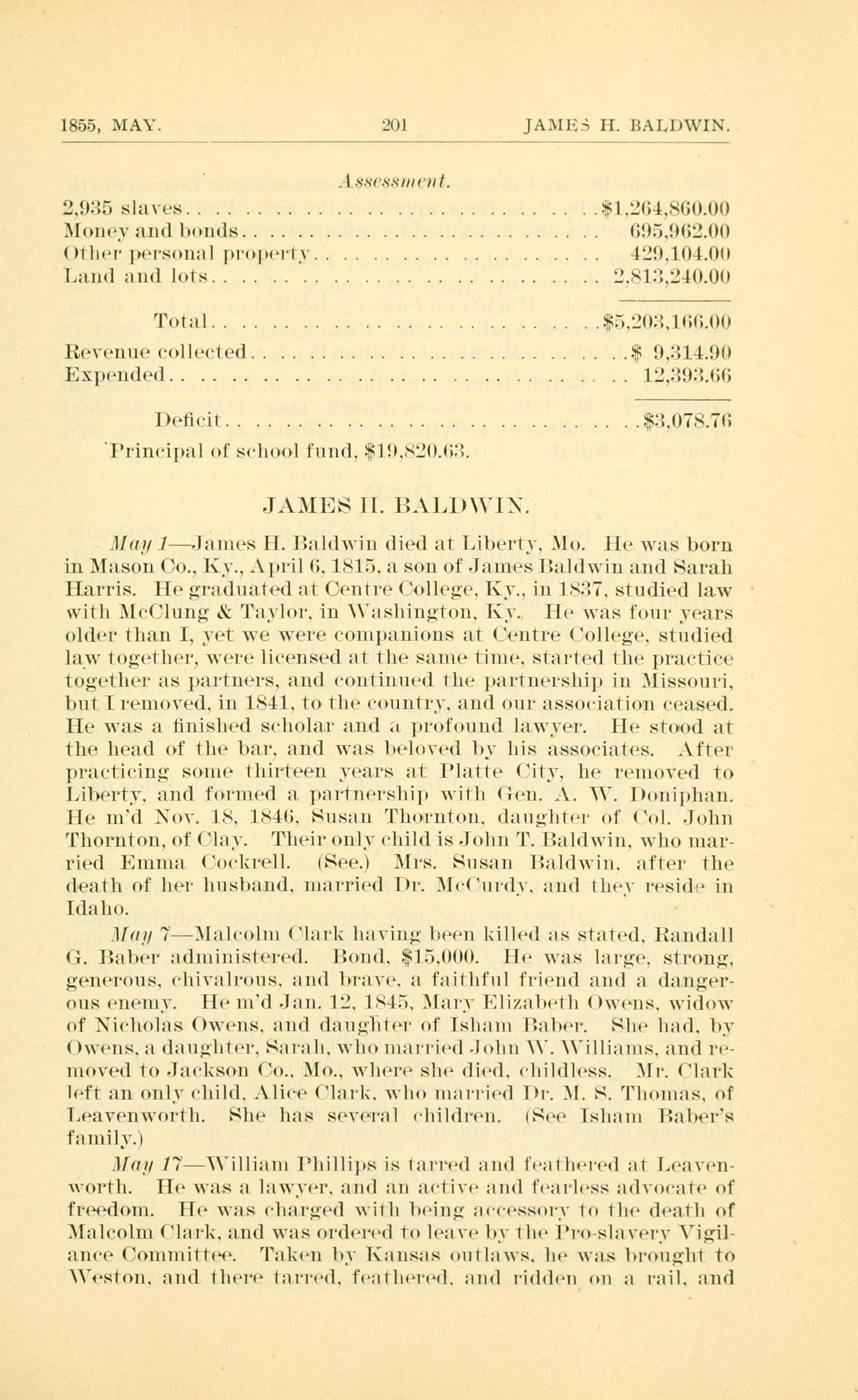 May 1 - James H. Baldwin died at Liberty, Mo.