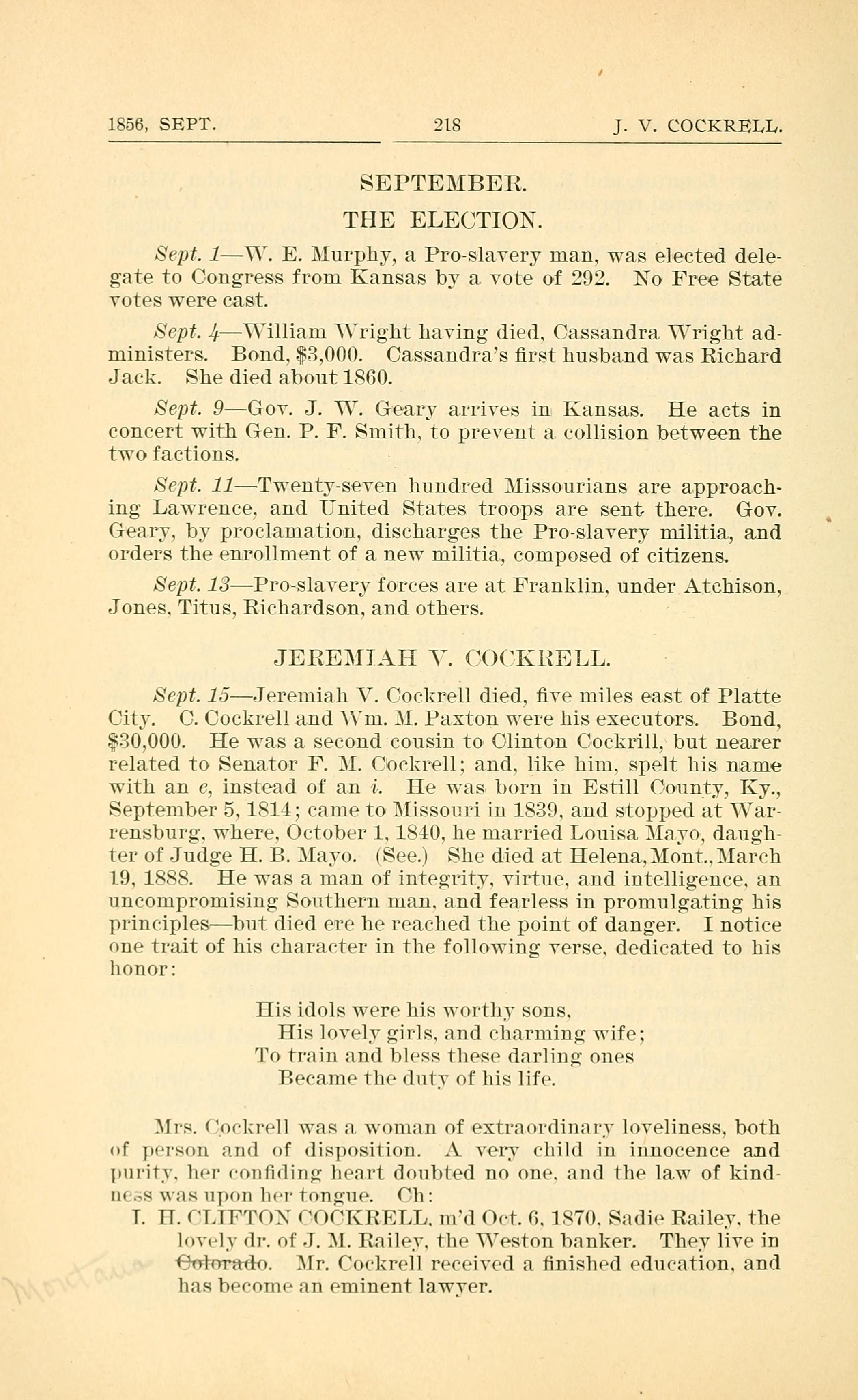 Sept. 15-Jeremiah V. Cockrell died, ve miles east of Pla.tte