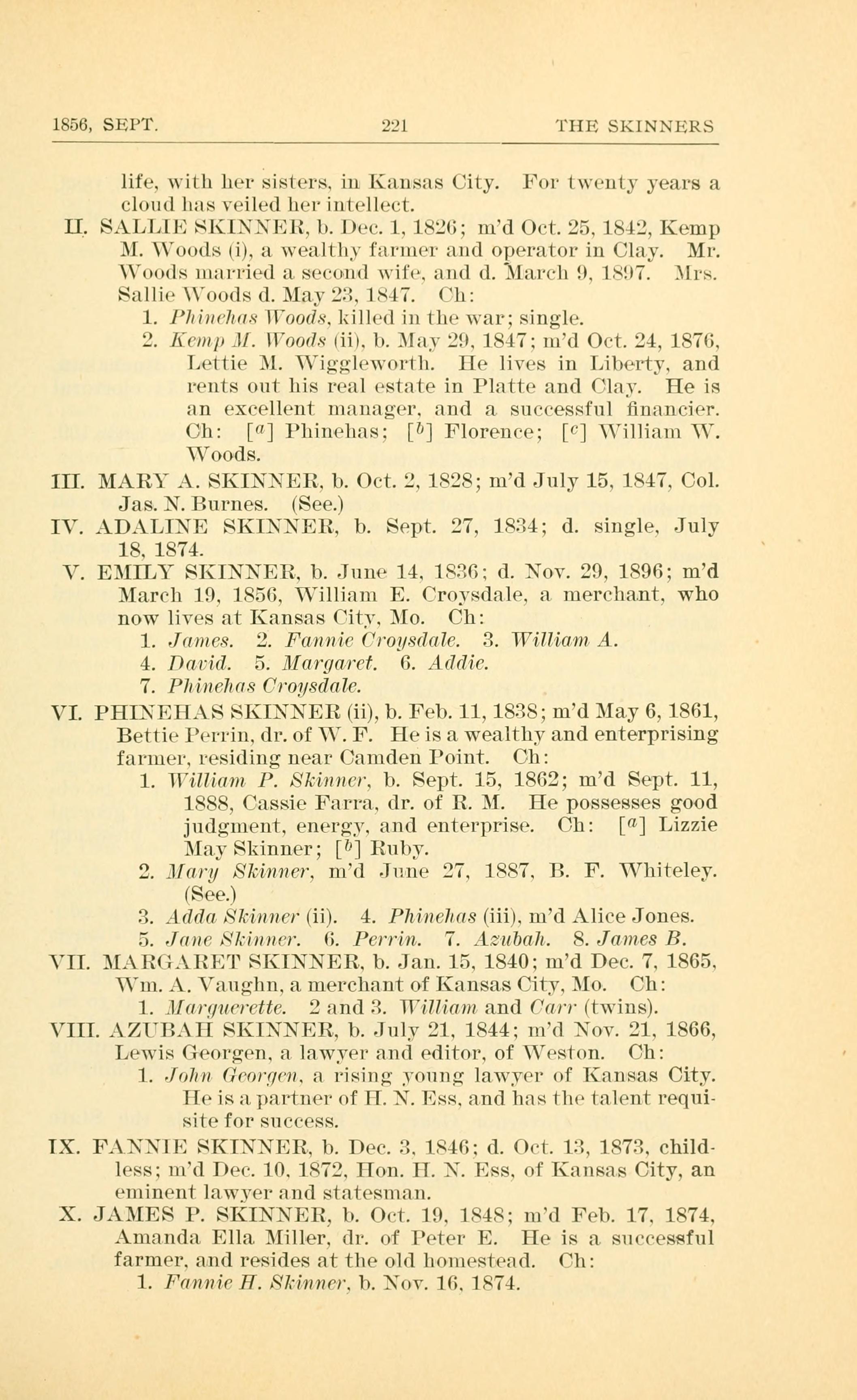 X. JAMES P. SKINNER, b. Oct. 19. 1848; md Feb. 17. 1874.