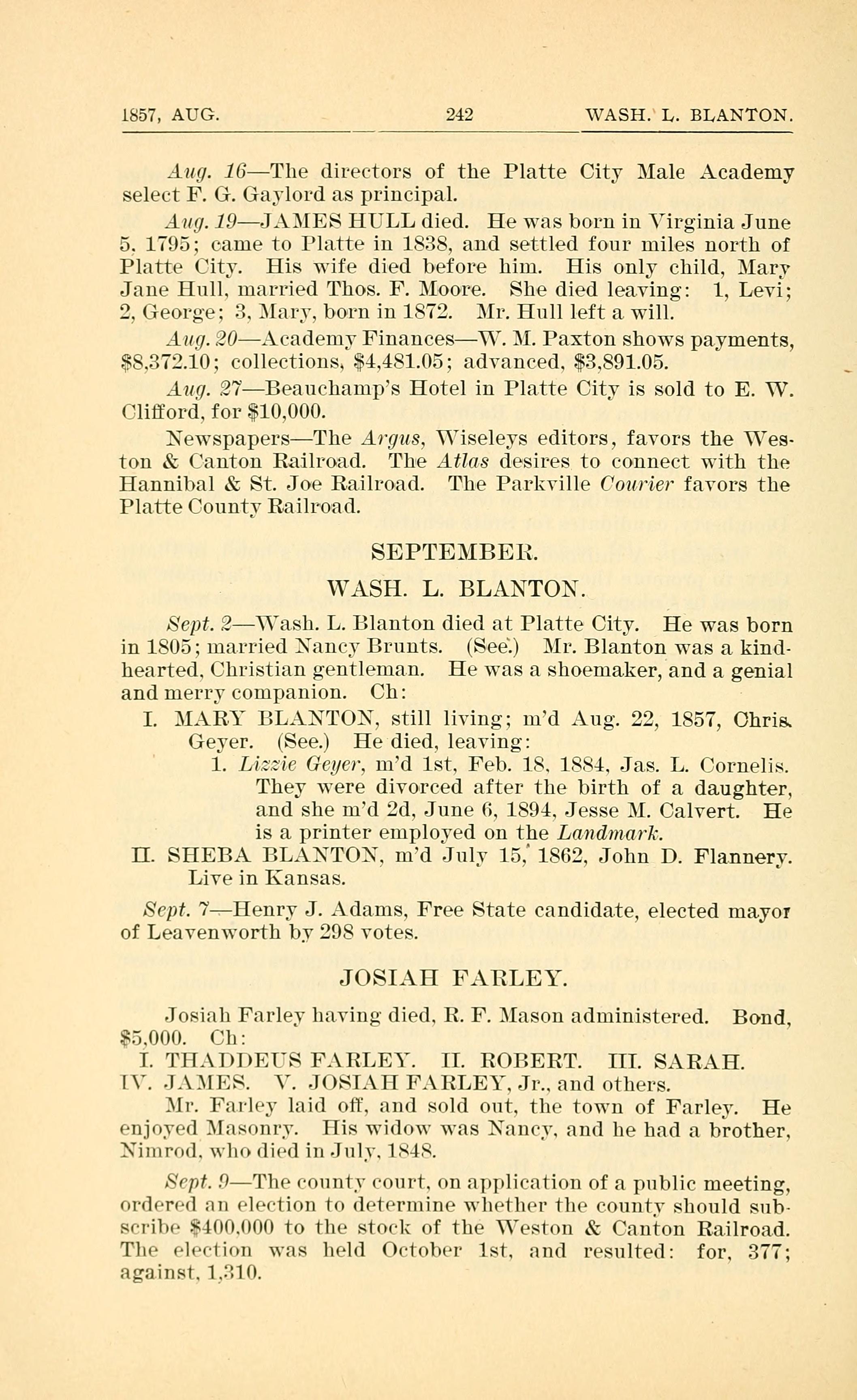 Sept. 2YVa.sh. L. Blanton died at Platte City. He Was born