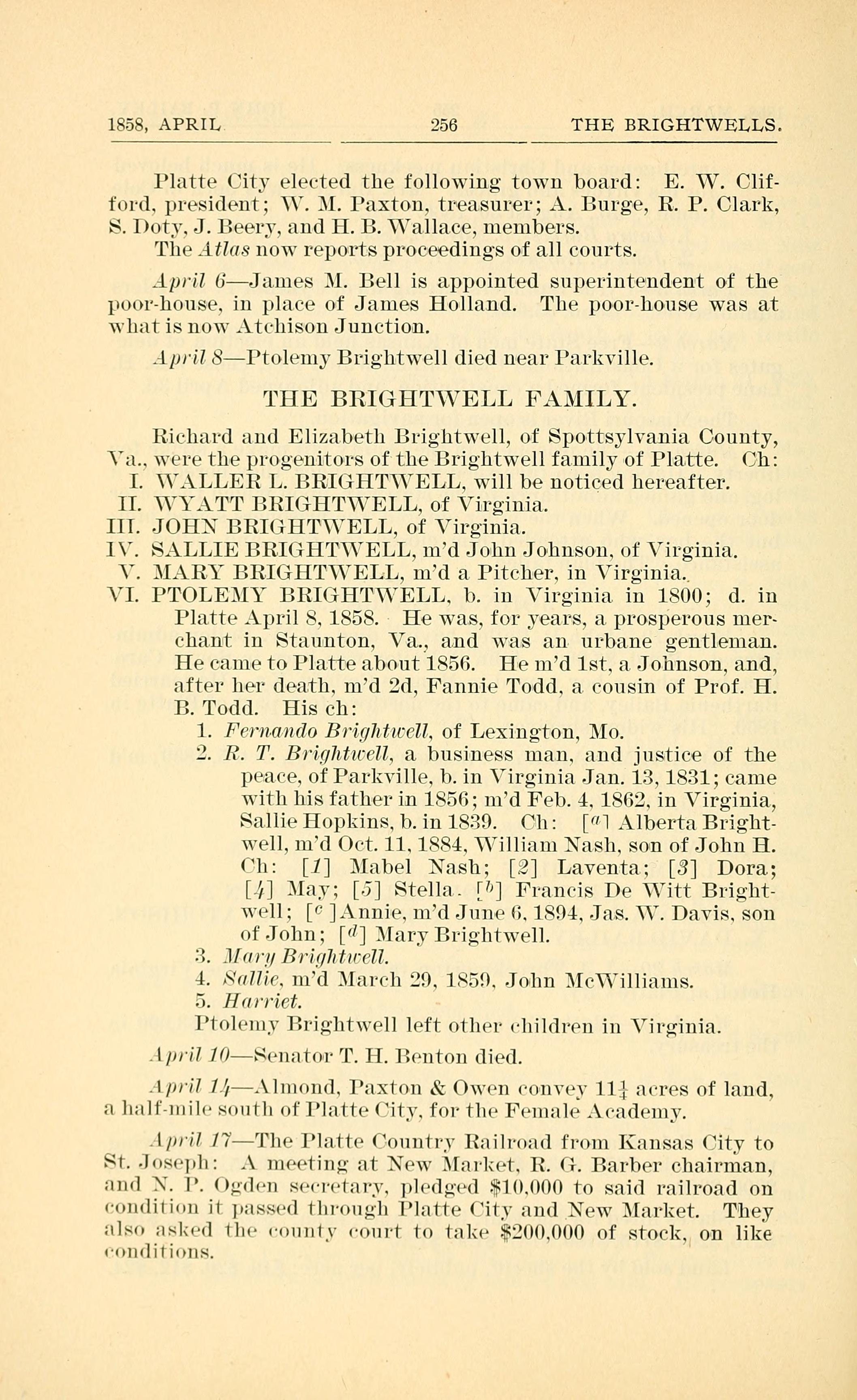 Richard and Elizabeth Brightwell, of Spottsylvania County, Va., were the progenitors of the Brightwell family of Platte. Children:
