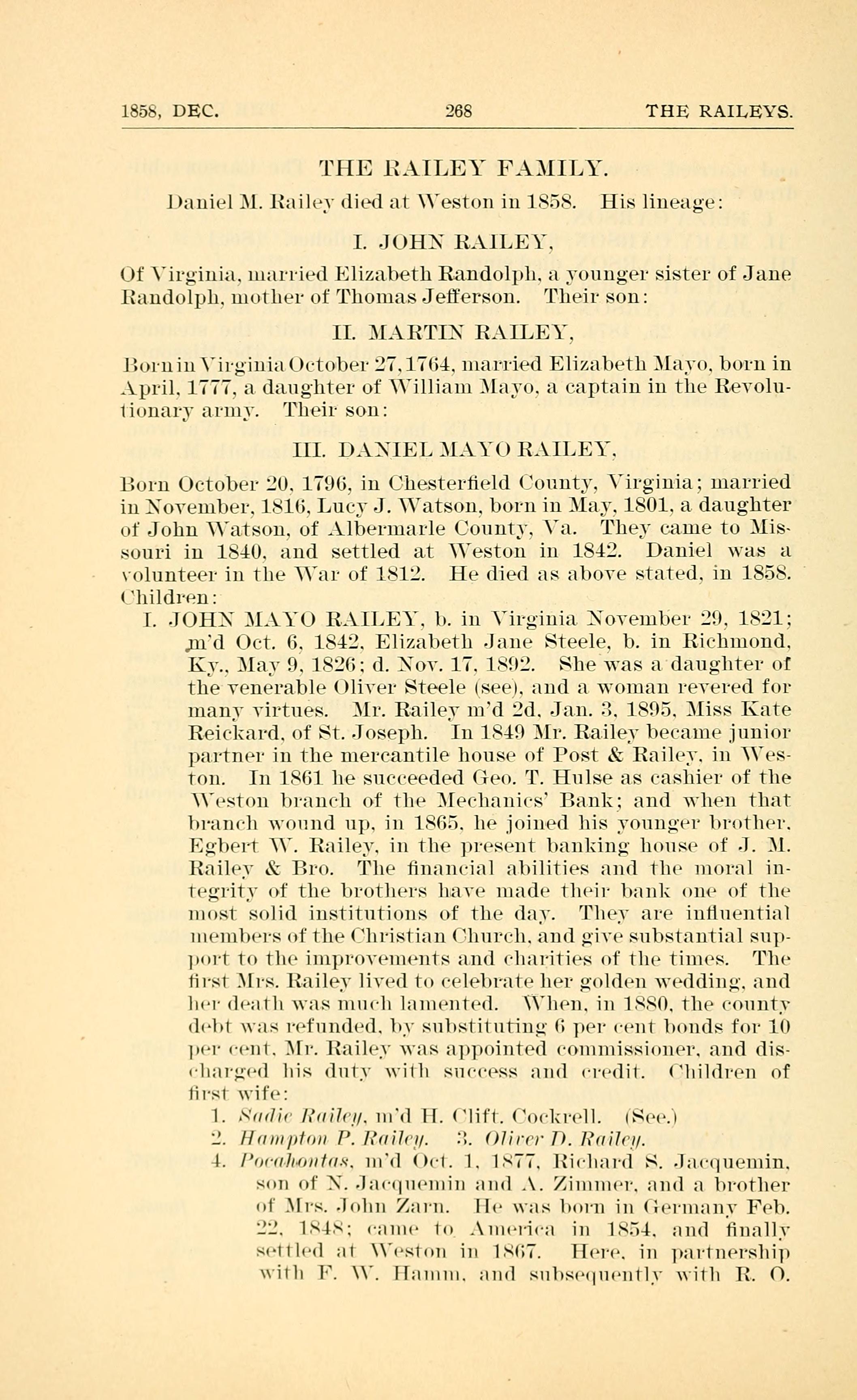 Daniel M. Railey died at Weston in 1858. His lineage: