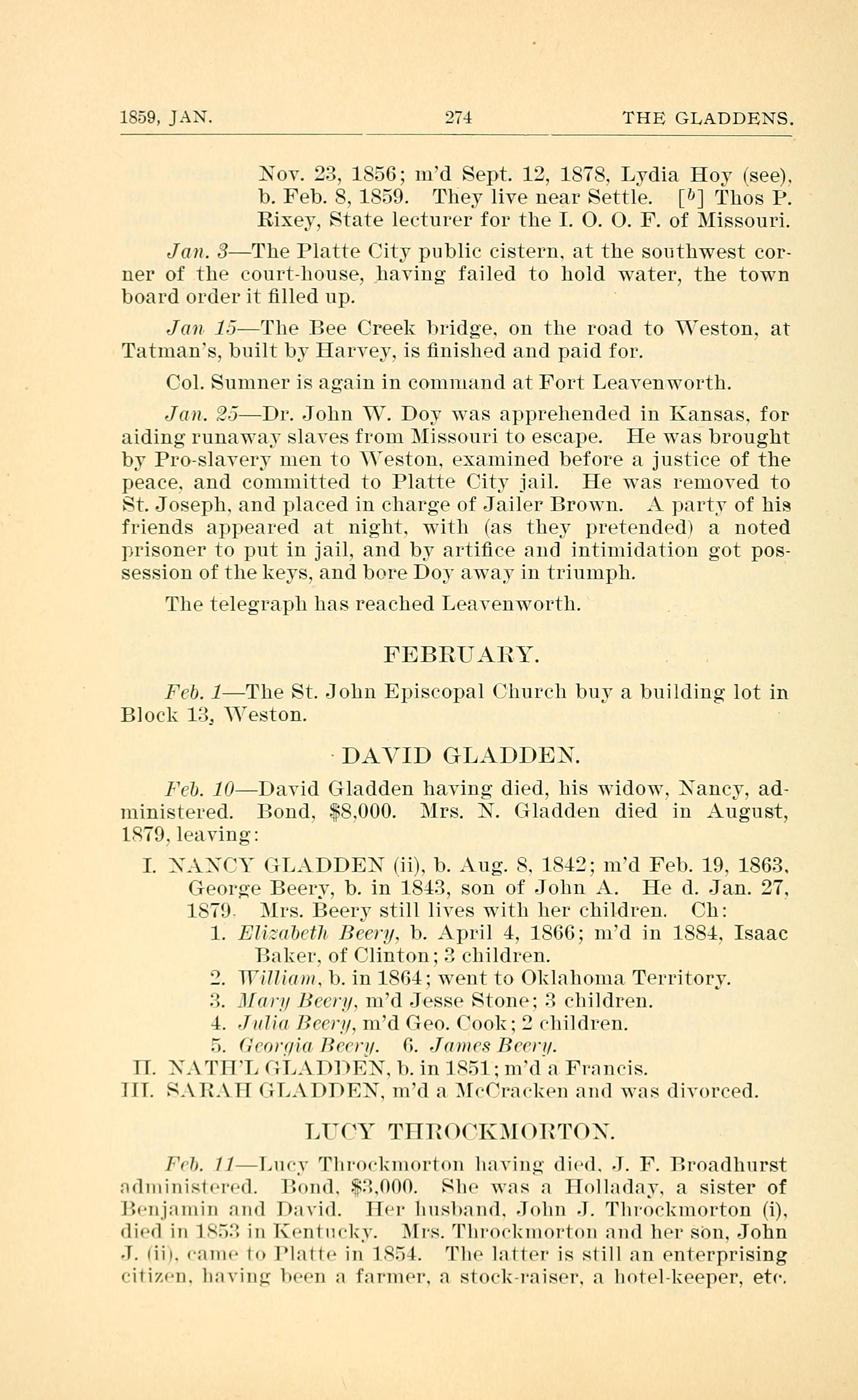 Bond, $3,000. She was a Holladay, a sister of Benjamin and David. Her husband, John J. Throckmorton (i), died in 1853 in Kentucky. Mrs. Throckmorton and her son, John J. (ii), came to Platte in 1854. The latter is still an enterprising citizen, having been a farmer, a stock-raiser, a hotel-keeper, etc.