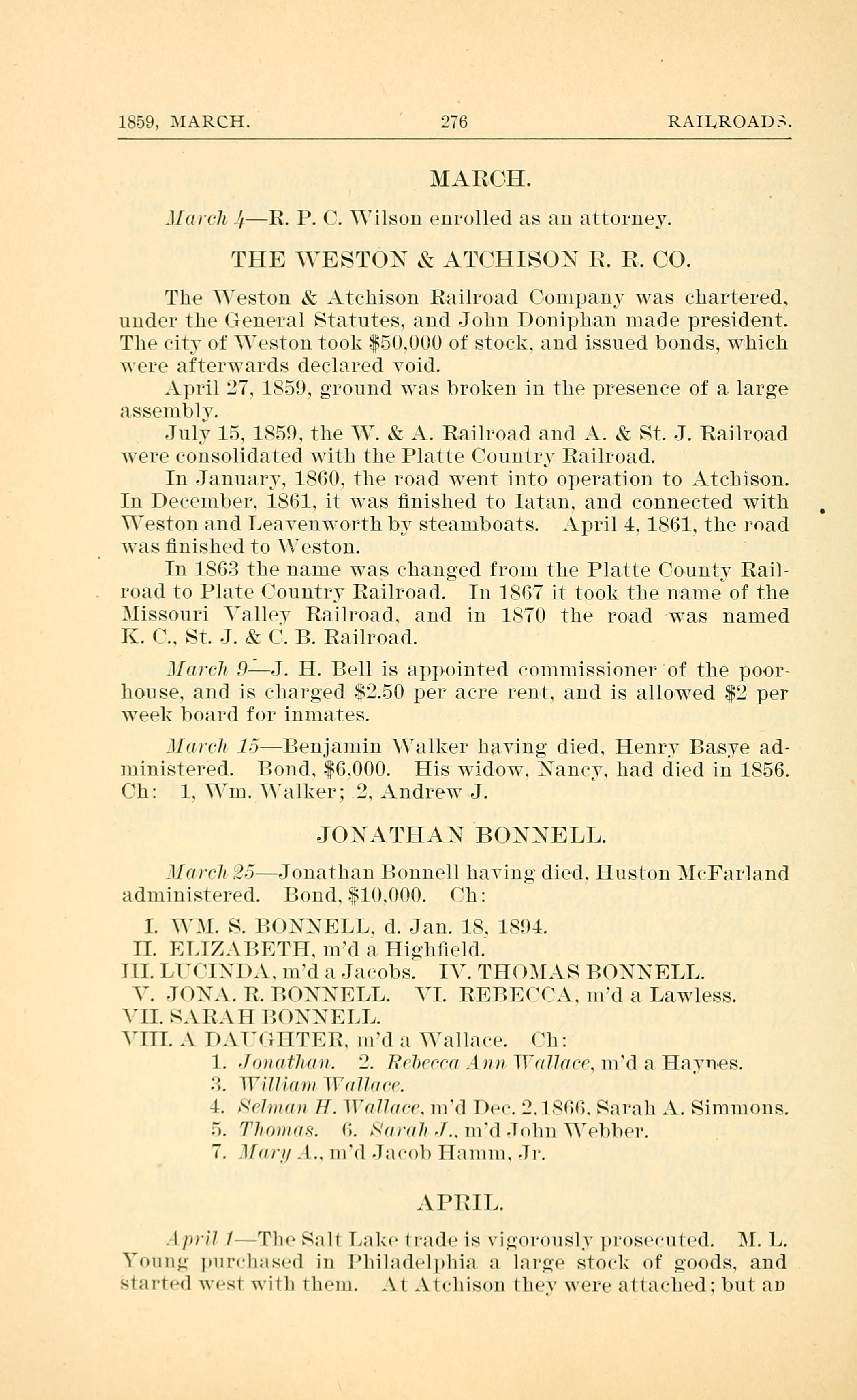 July 15, 1859, the W. & A. Railroad and A. & St. J. Railroad were consolidated with the Platte Country Railroad.