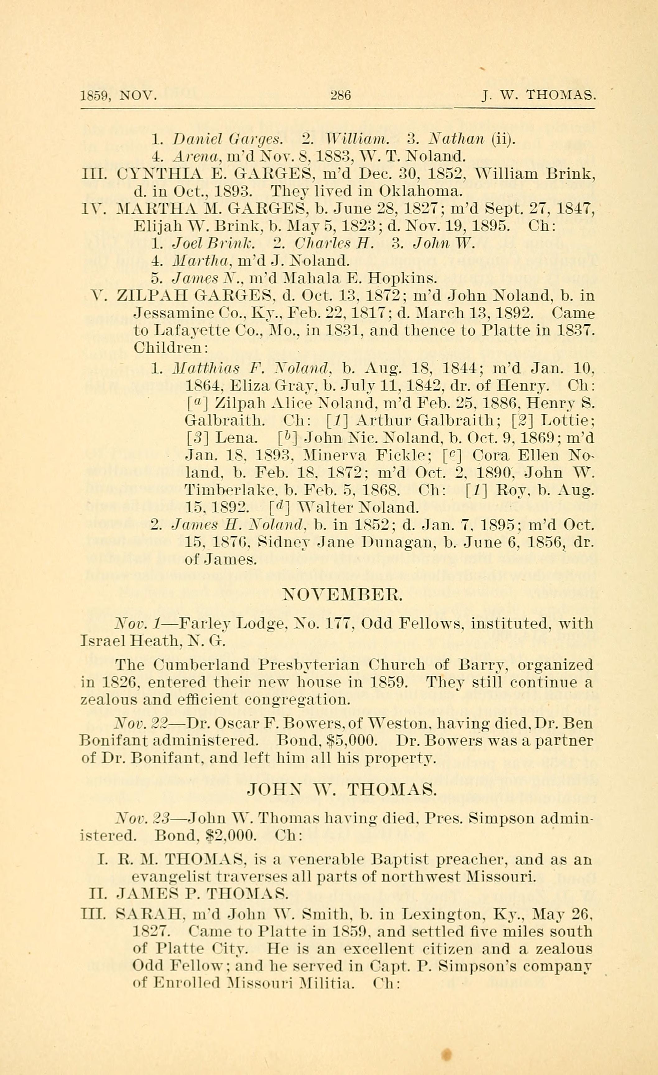 V. ZILPAH GARGES, d. Oct. 13, 1872; married John Noland, b. in Jessamine Co., Ky., Feb. 22, 1817; d. March 13, 1892. Came to Lafayette Co., Mo., in 1831, and thence to Platte in 1837. Children: