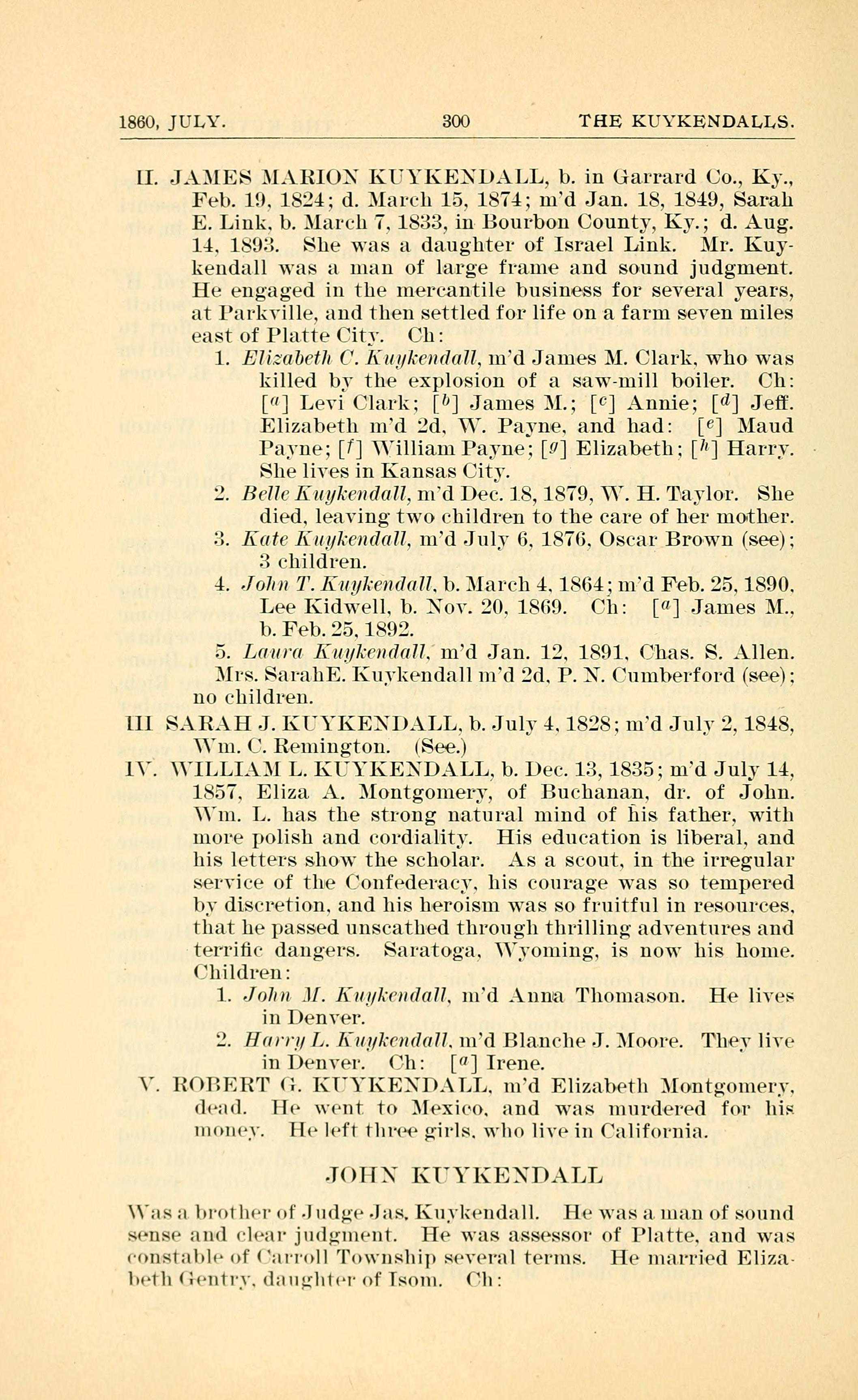 II. JAMES MARION KUYKENDALL, b. in Garrard Co., Ky, Feb. 19. 1824; d. March 15, 1874; md Jan. 18, 1849, Sarah E. Link. b. March 7, 1833, in Bourbon County, KY; d. Aug. 11. 1893. She was a daughter of Israel Link. Mr. Kuykendall was a man of large frame and sound judgment. He engaged in the mercantile business for several years, at Parkville, and then settled for life on a farm seven miles east of Platte City. Children: