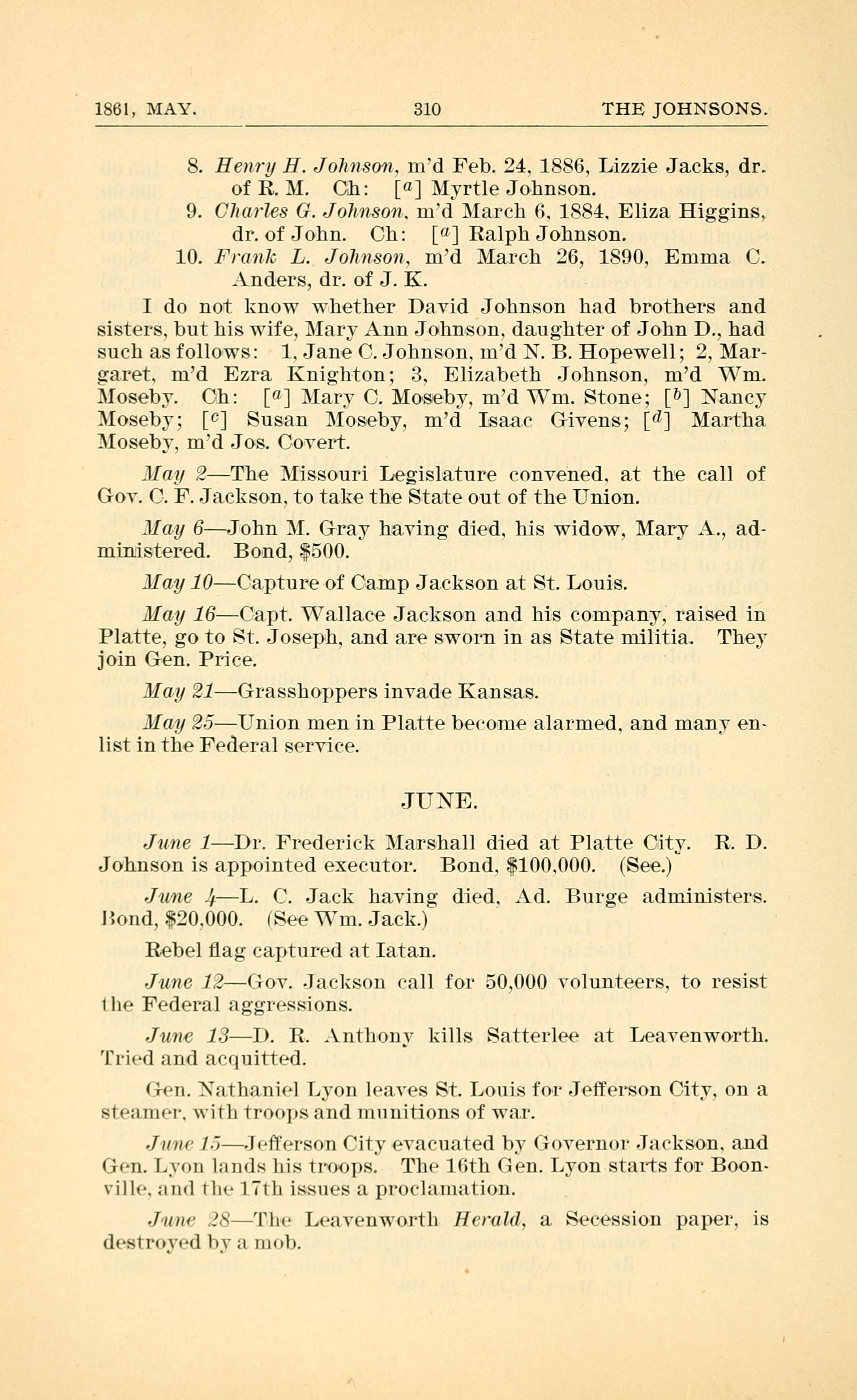 Jmze 1Dr. Frederick Marshall died at Platte City. R. D.