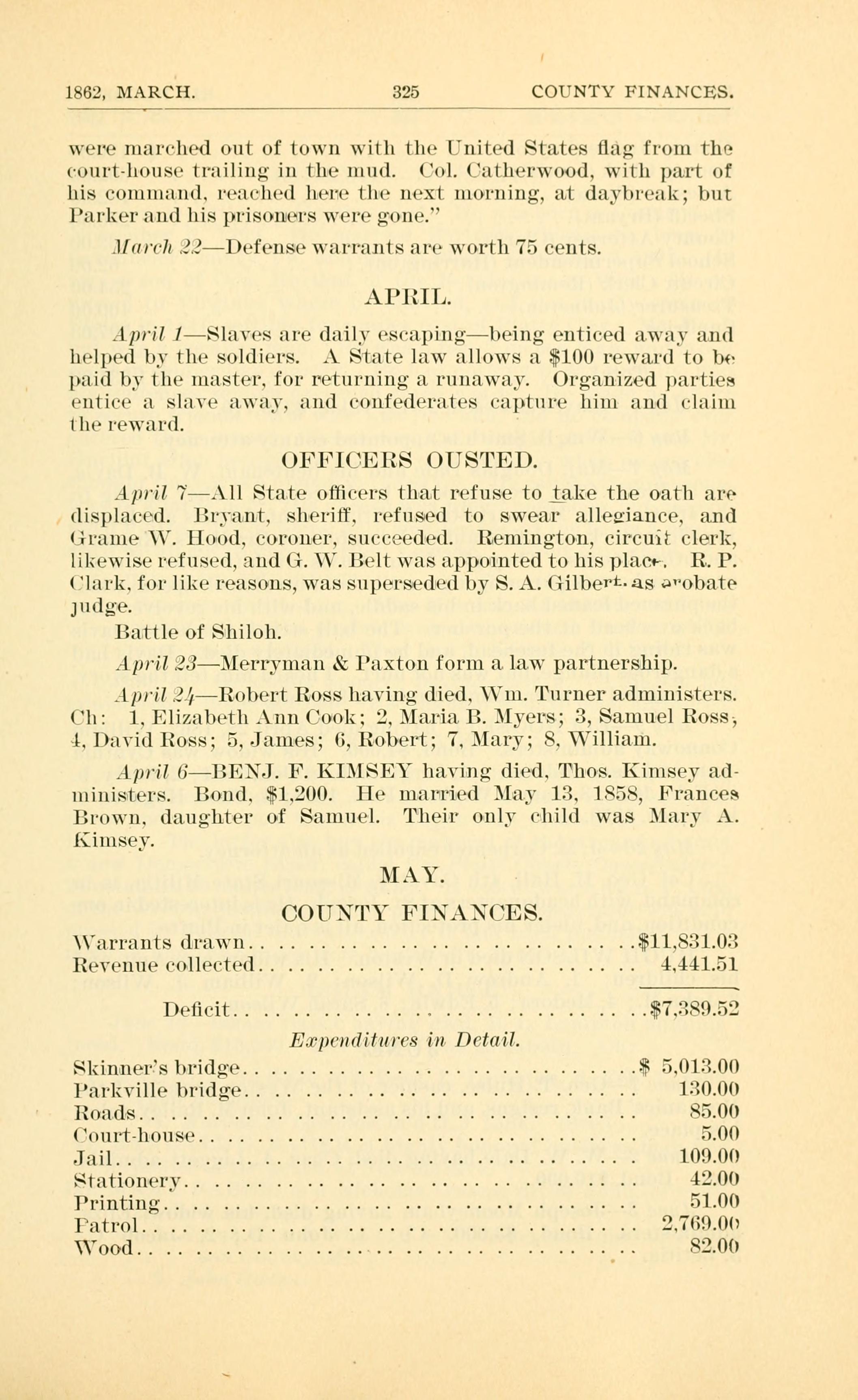 April 7 - All state officers that refuse to take the oath are displaced. Bryant, sheriff, refused to swear allegiance, and Grame W. Wood, coroner, succeeded. Remington, circuit clerk, likewise refused, and G. W. Belt was appointed to his place. R. P. Clark, for like reasons, was superseded by S. A. Gilbert as probate judge.