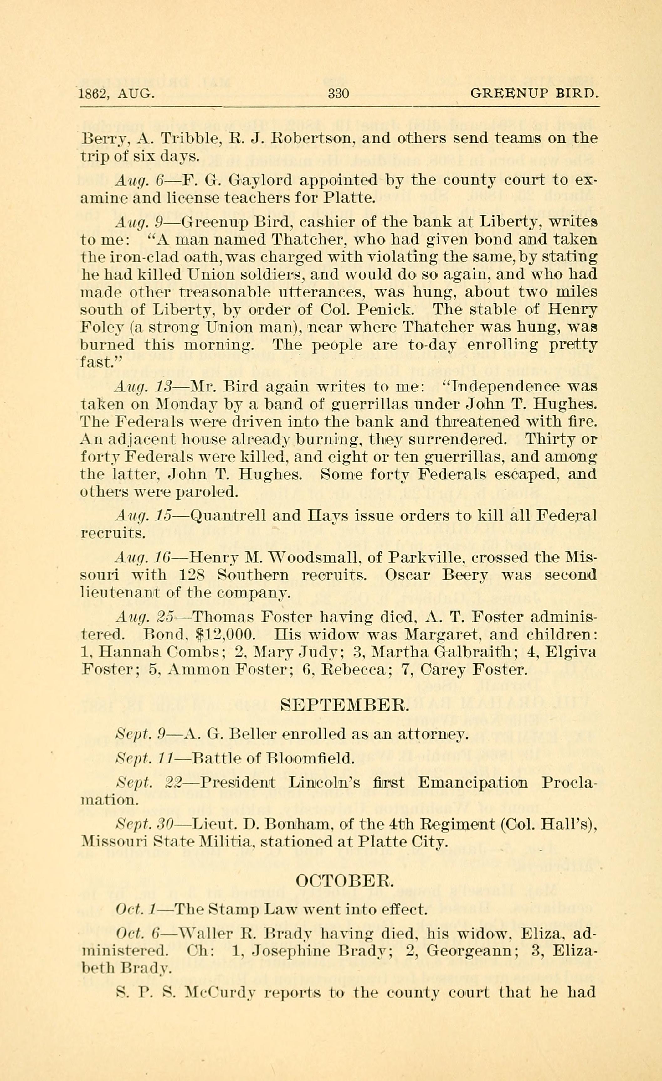 Aug. 15Qua.ntrell and Hays issue orders to kill all Federal