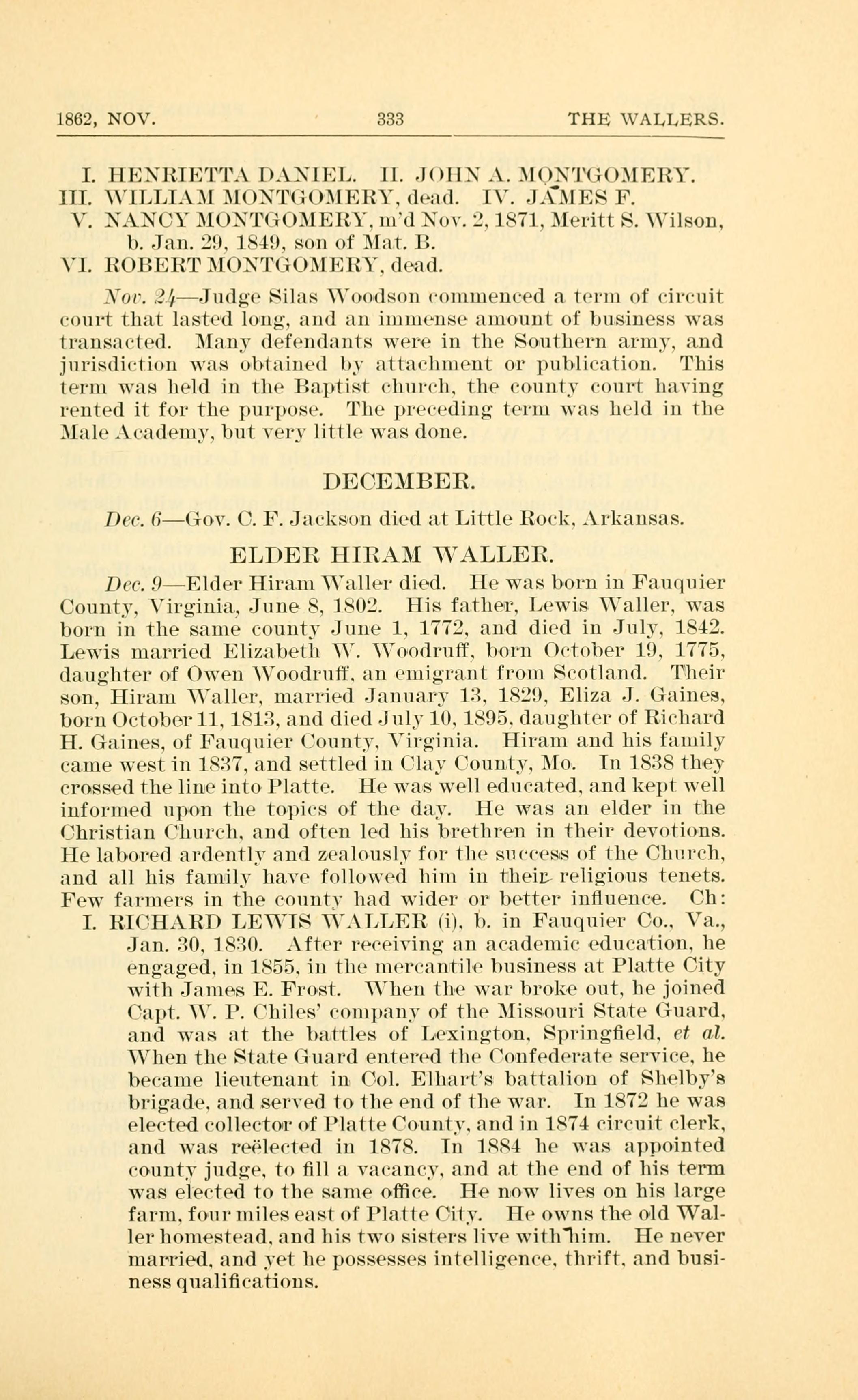 Dec. 9 - Elder Hiram Waller died. He was born in Fauquier County, Virginia, June 8, 1802. His father, Lewis Waller, was born in the same county June 1, 1772, and died in July, 1842. Lewis married Elizabeth W. Woodruff, born October 19, 1775, daughter of Owen Woodruff, an emigrant from Scotland. Their son, Hiram Waller, married January 13, 1829, Eliza J. Gaines, born October 11, 1813, and died July 10, 1895, daughter of Richard H. Gaines, of Fauquier County, Virginia. Hiram and his family came west in 1837, and settled in Clay County, Mo. In 1838 they crossed the line into Platte.
