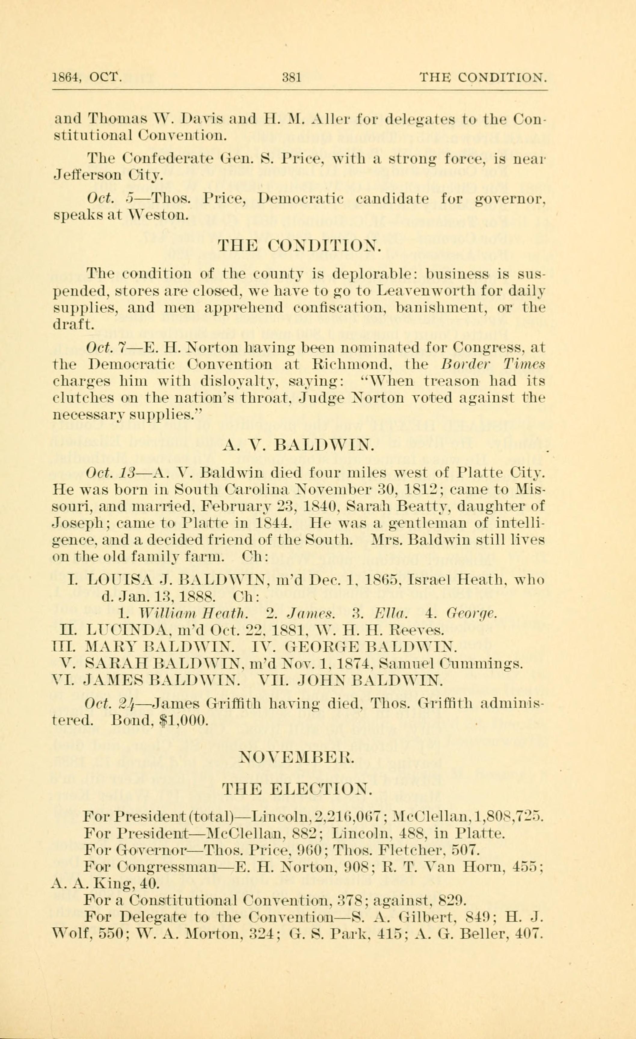A. V. BALDWIN, having died four miles west of Platte City.