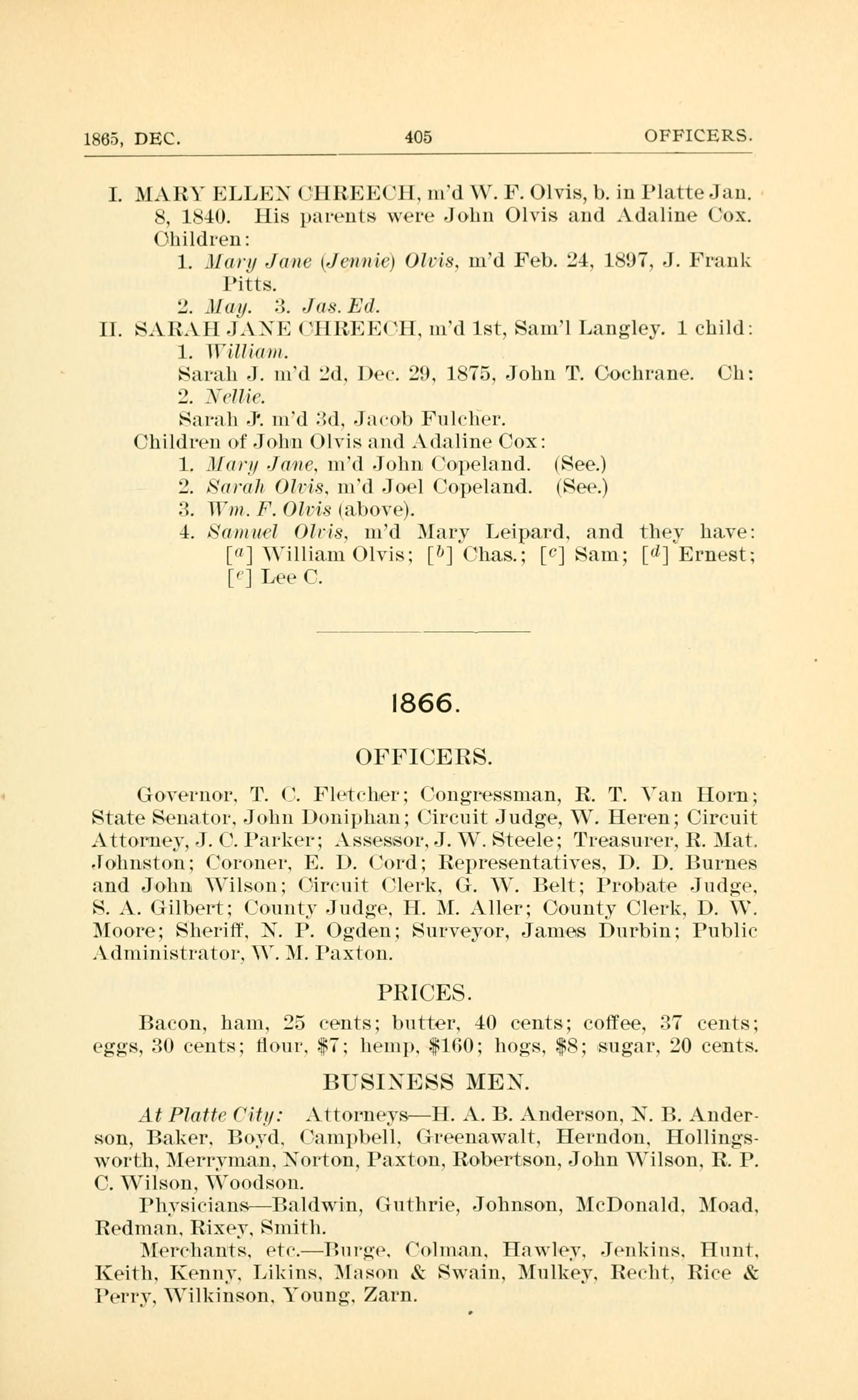I. MARY ELLEN CHREECH, married W. F. Olvis, of John Olvis and Adaline Cox