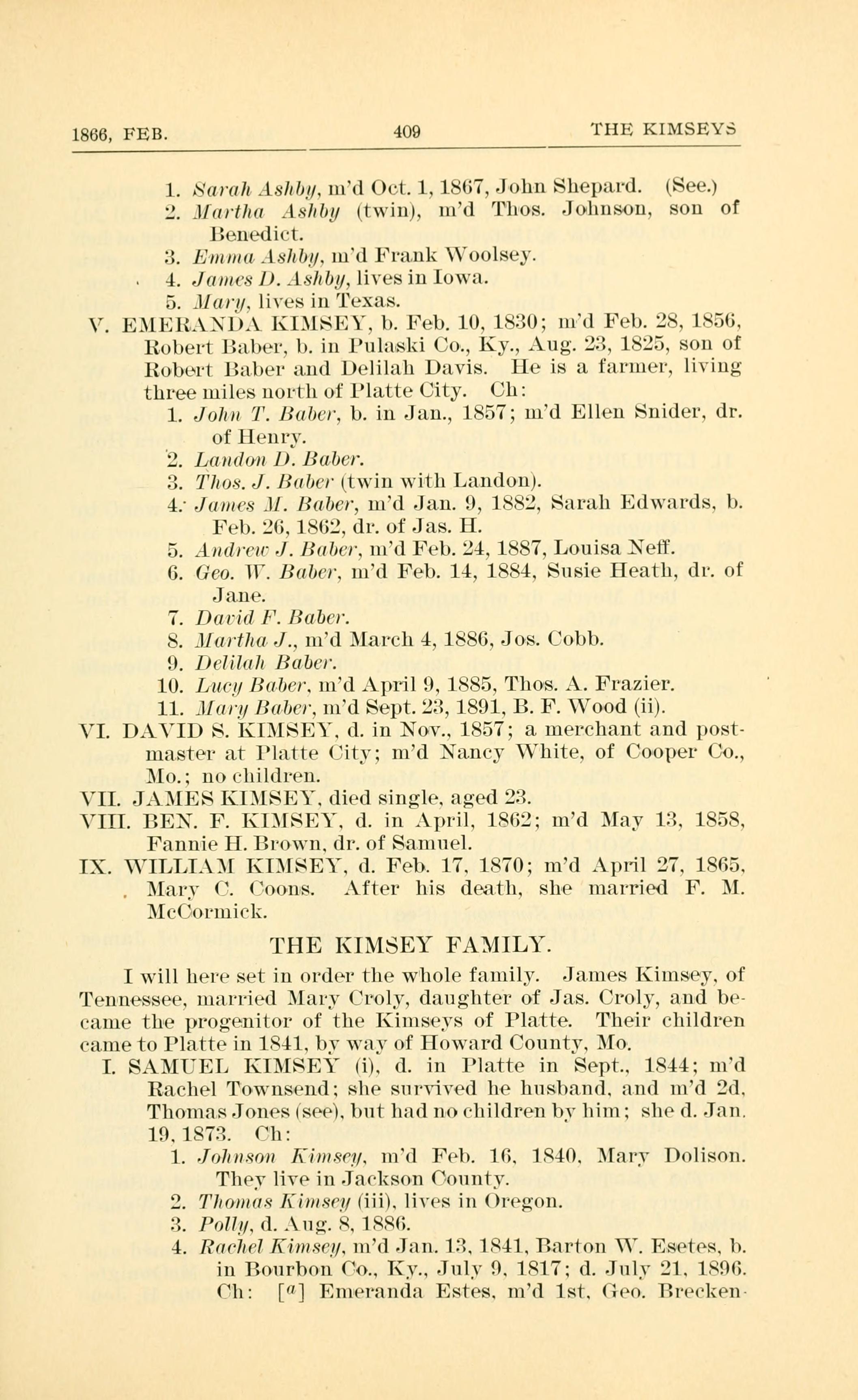 V. EMERANDA KIMSEY, b. Feb. 10, 1830; married Feb. 28, 1856, Robert Baber, b. in Pulaski Co., Ky., Aug. 23, 1825, son of Robert Baber and Delilah Davis. He is a farmer, living three miles north of Platte City. Children: