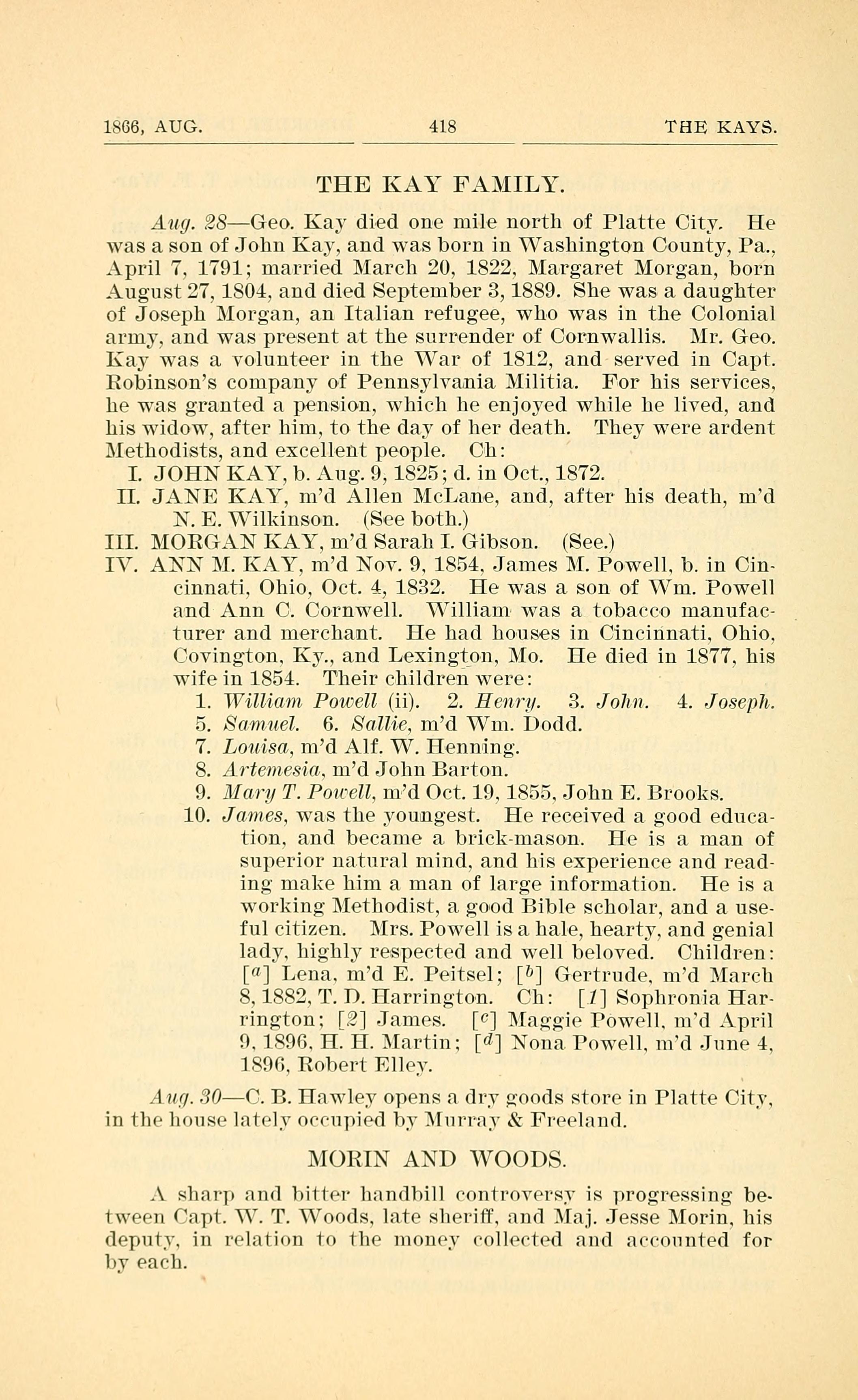 IV. ANN M. KAY, md Nov. 9, 1854, James M. Powell. b. in Cin-