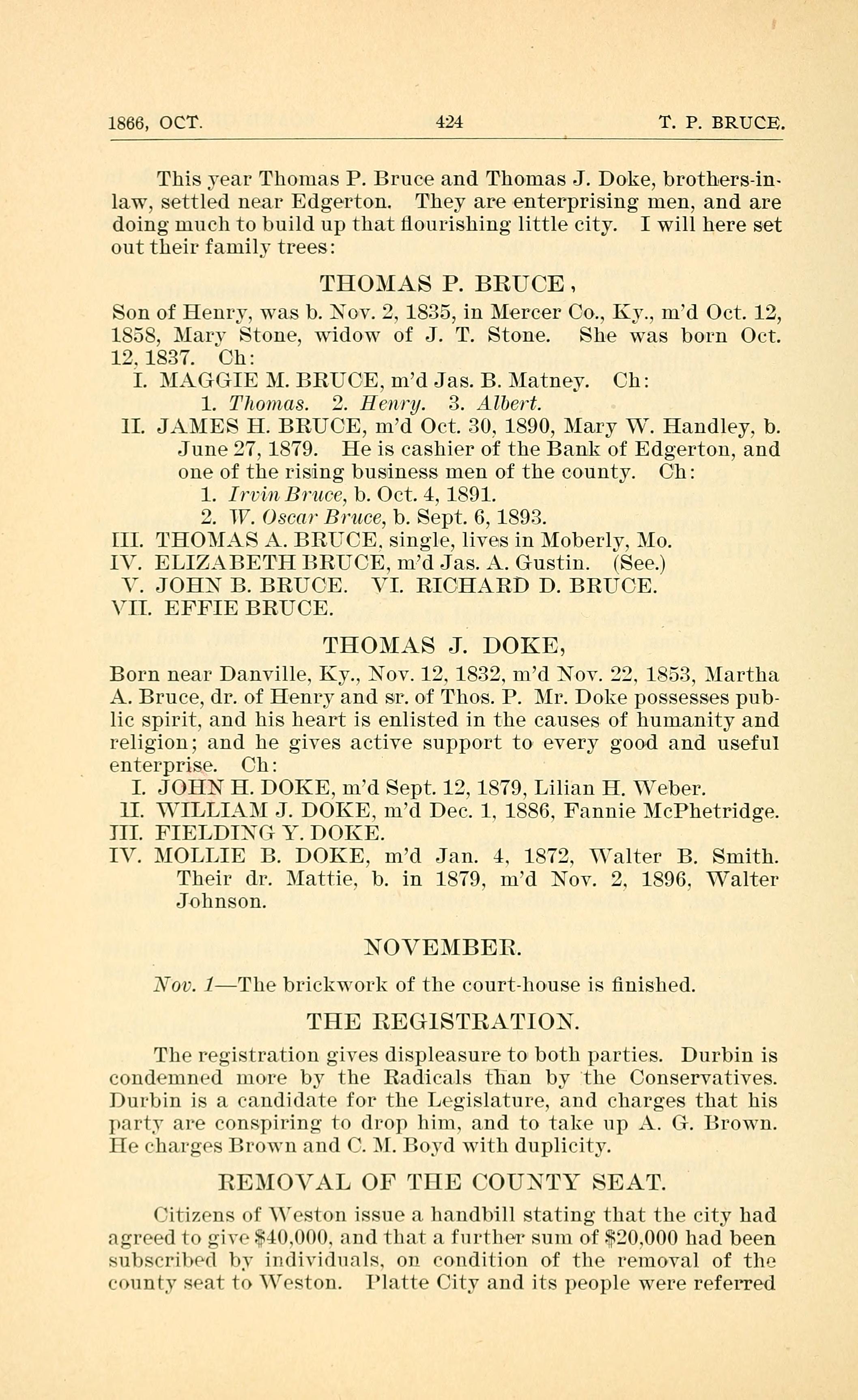 III. THOMAS A. BRUCE. single, lives in Moberly, Mo.