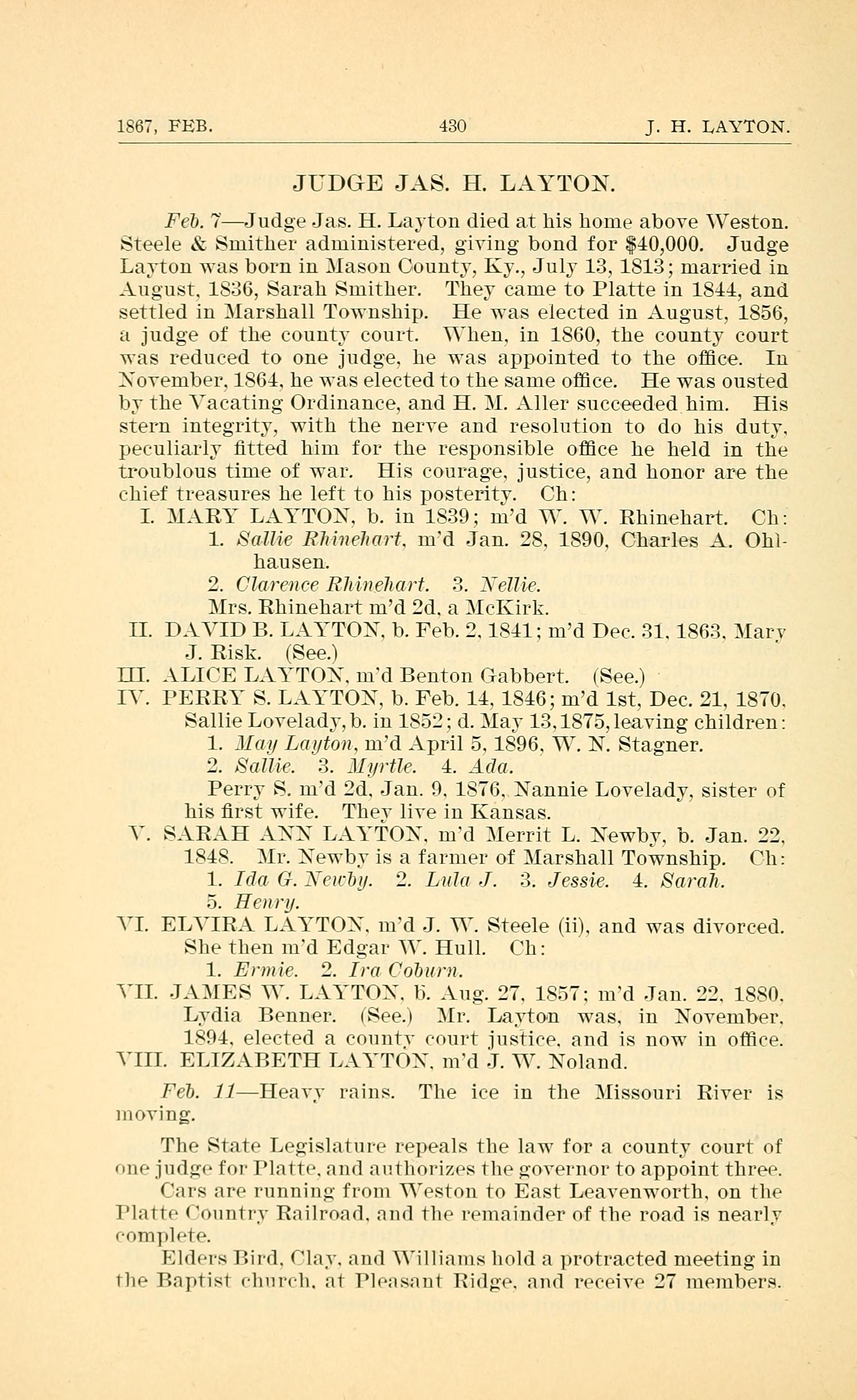 Feb. 7 Judge Jas. H. Layton died at his home above Weston.