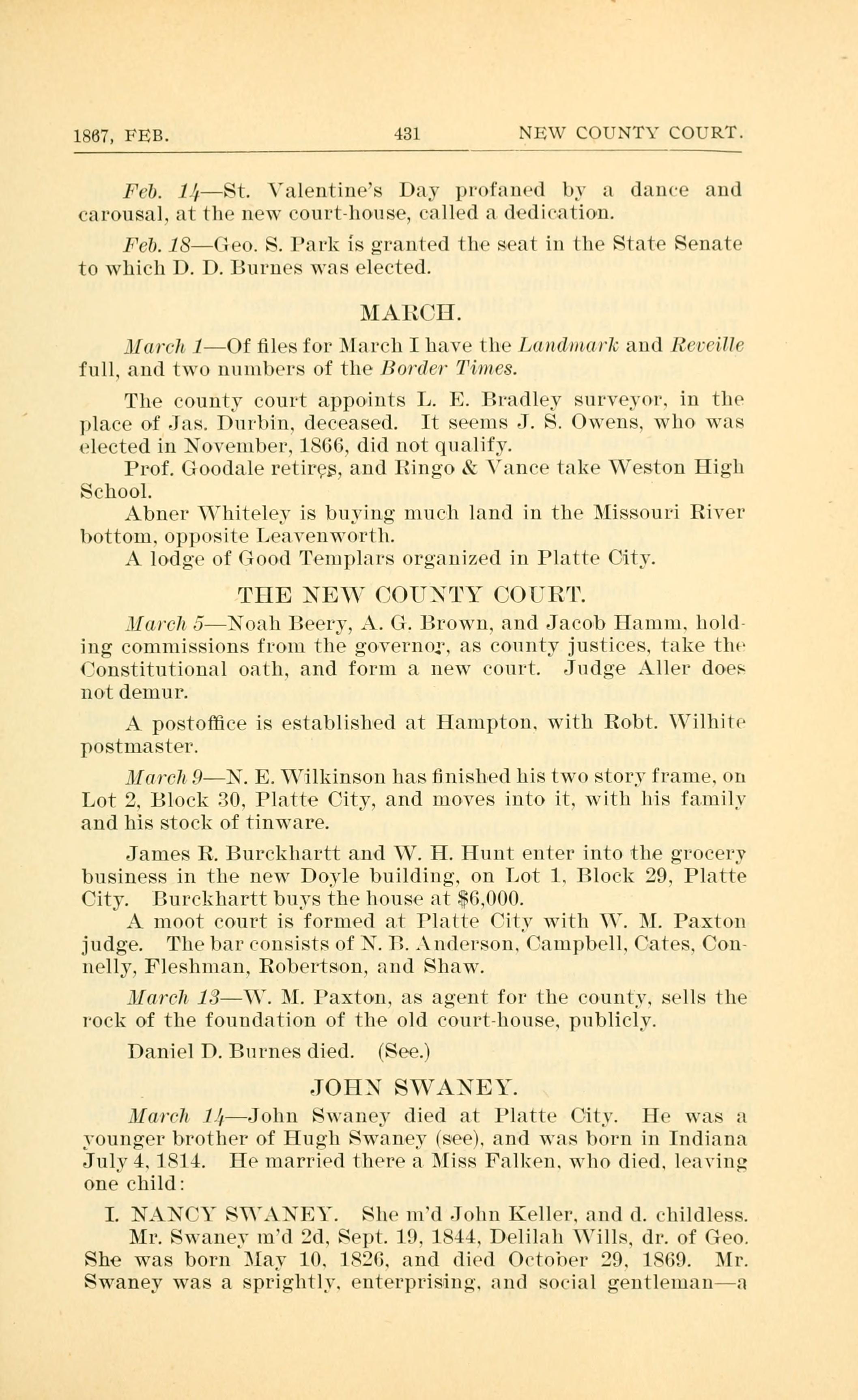 March 14 - John Swaney died at Platte City. He was younger brother of Hugh Swaney, and was born in Indiana July 4, 1814. He married there a Miss Falken, who died, leaving one child: