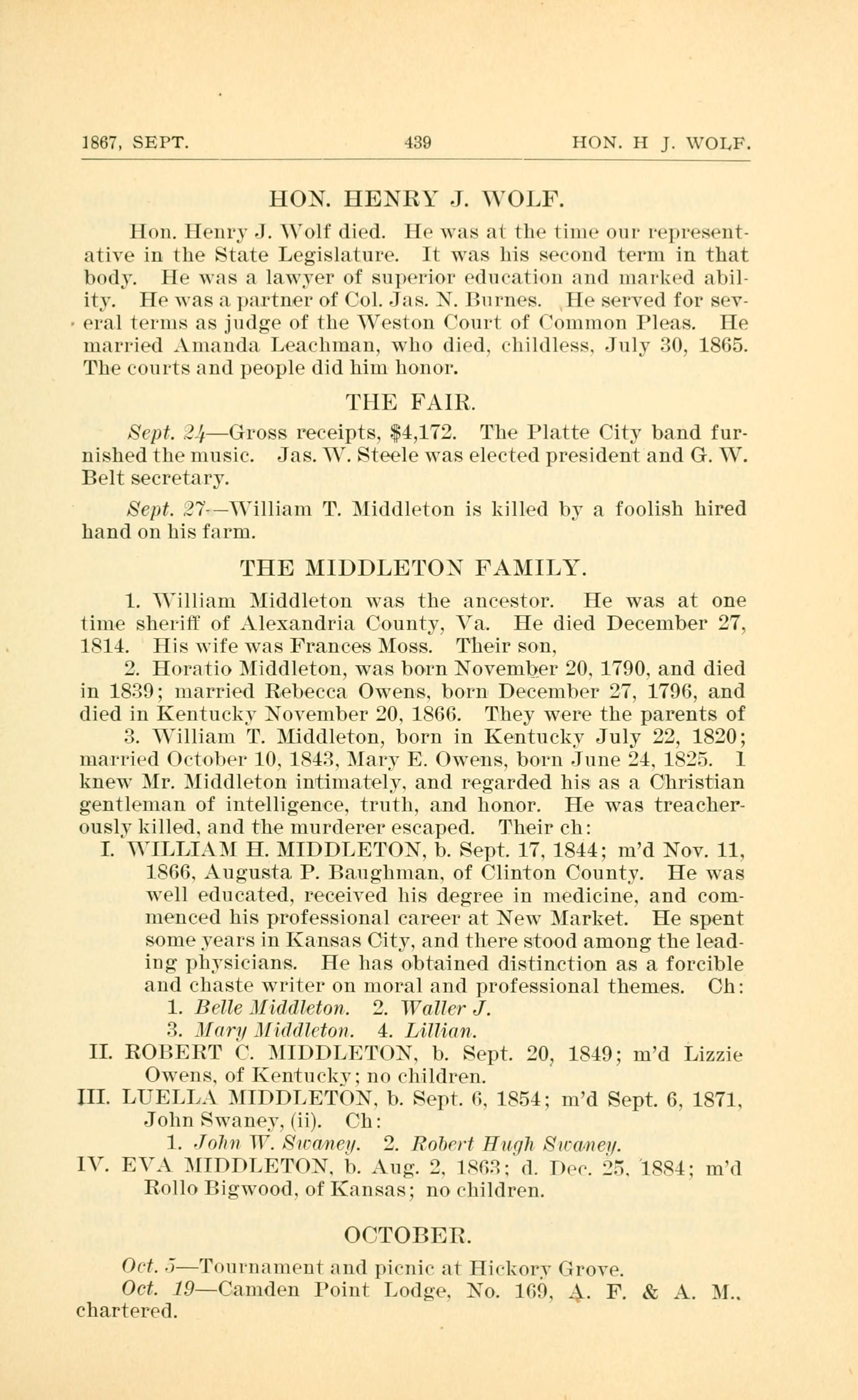 I. WILLIAM H. MIDDLETON, b. Sept. 17, 1844; married Nov. 11, 1866. Augusta P. Baughman. of Clinton County. He was well educated, received his degree in medicine, and commenced his professional career at New Market. He spent some years in Kansas City. and there stood among the leading physicians. He has obtained distinction as a forcible and chaste writer on moral a11d professional themes. Children: