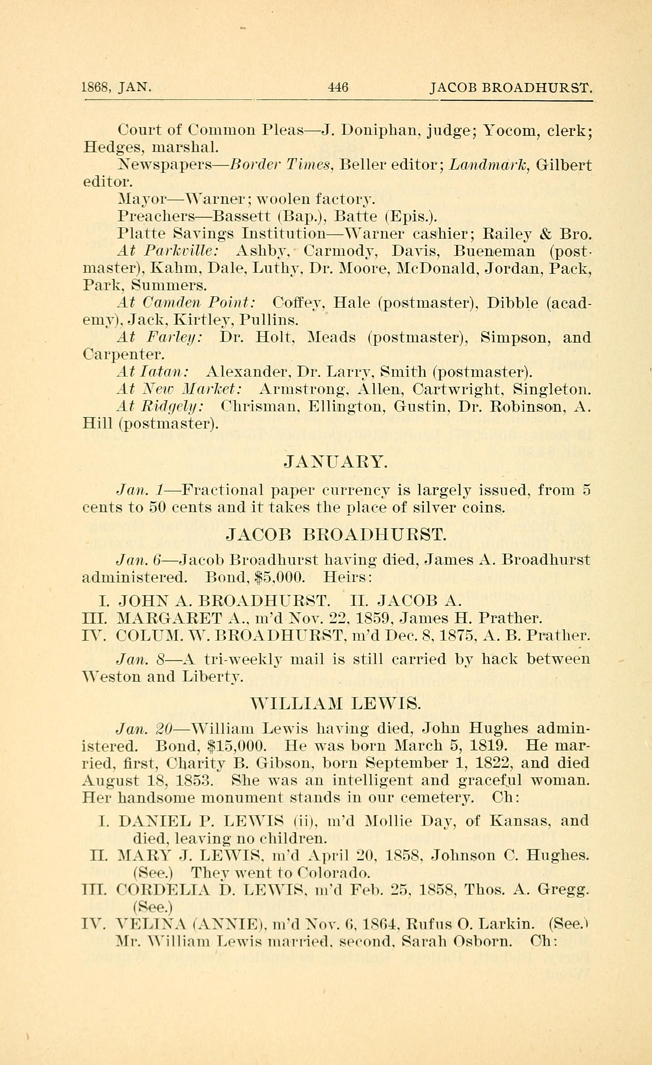 Jan. 20 - William Lewis having died, John Hughes administered. Bond, $15,000. He was born March 5, 1819. He married, 1st, Charity B. Gibson, born September 1, 1822, and died August 18, 1853. She was an intelligent and graceful woman.