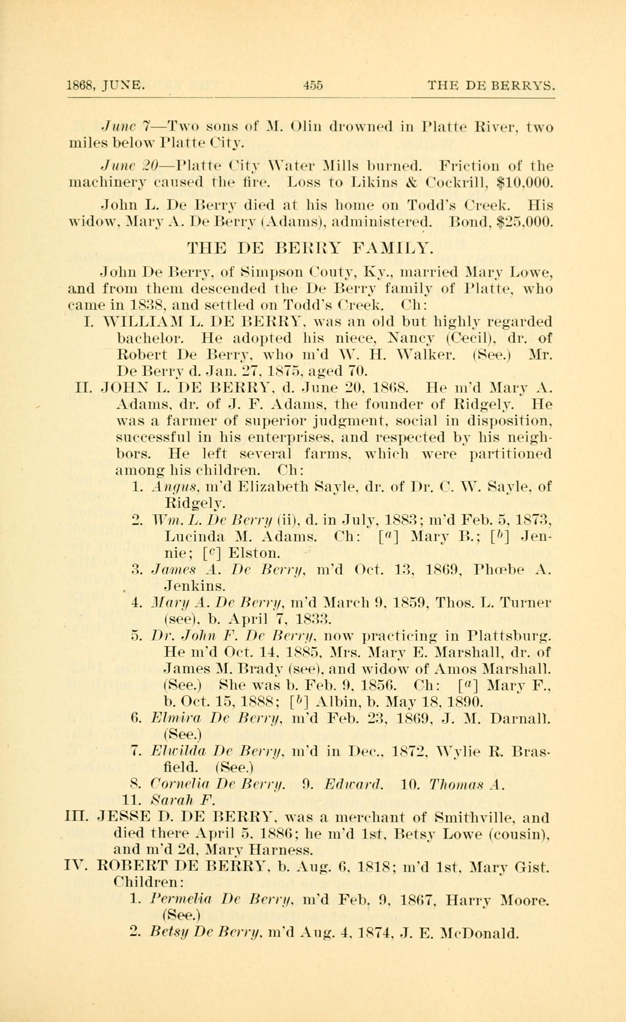 John De Berry of Simpson County, Ky., married Mary Lowe, and from them descended the De Berry family of Platte, who came in 1838, and settled on Todd's Creek. Children: