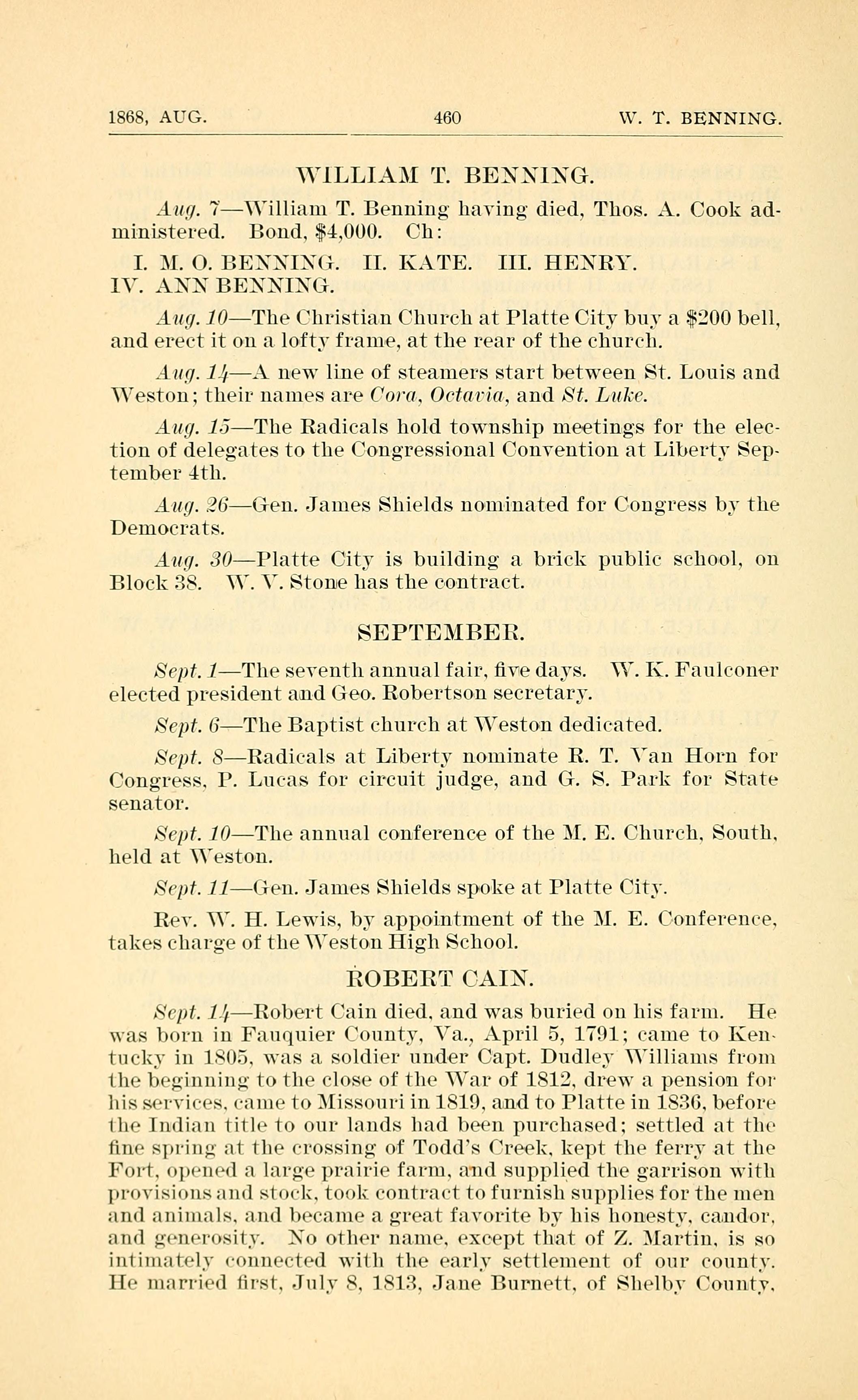 Sept. 1 - Robert Cain died. and was buried 011 his farm. He