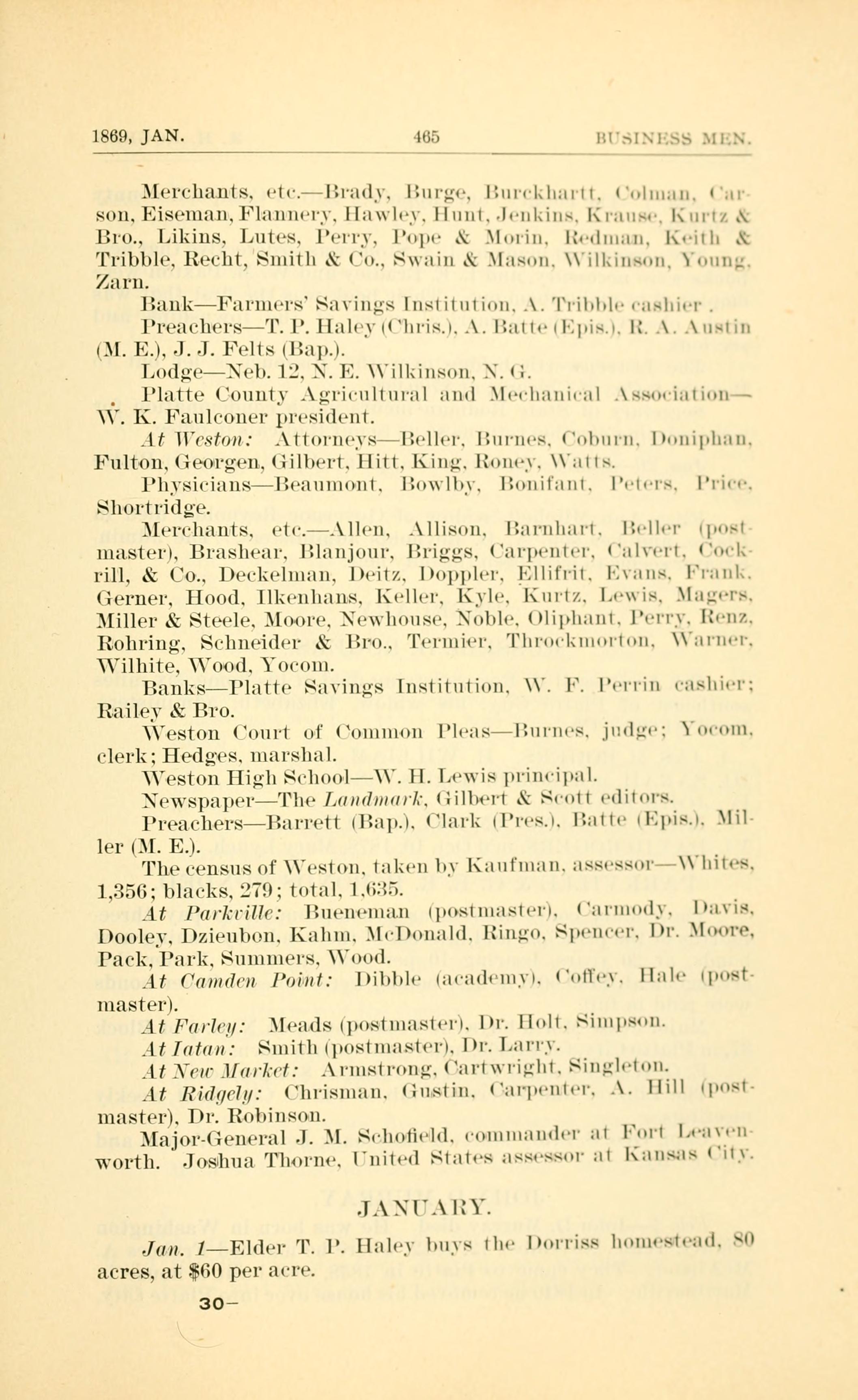 1869, JAN. 465 BUSINESS MEN Jan. 1 - Elder T. P. Haley buys the Dorriss homestead, 80 acres at $60 per acre.
