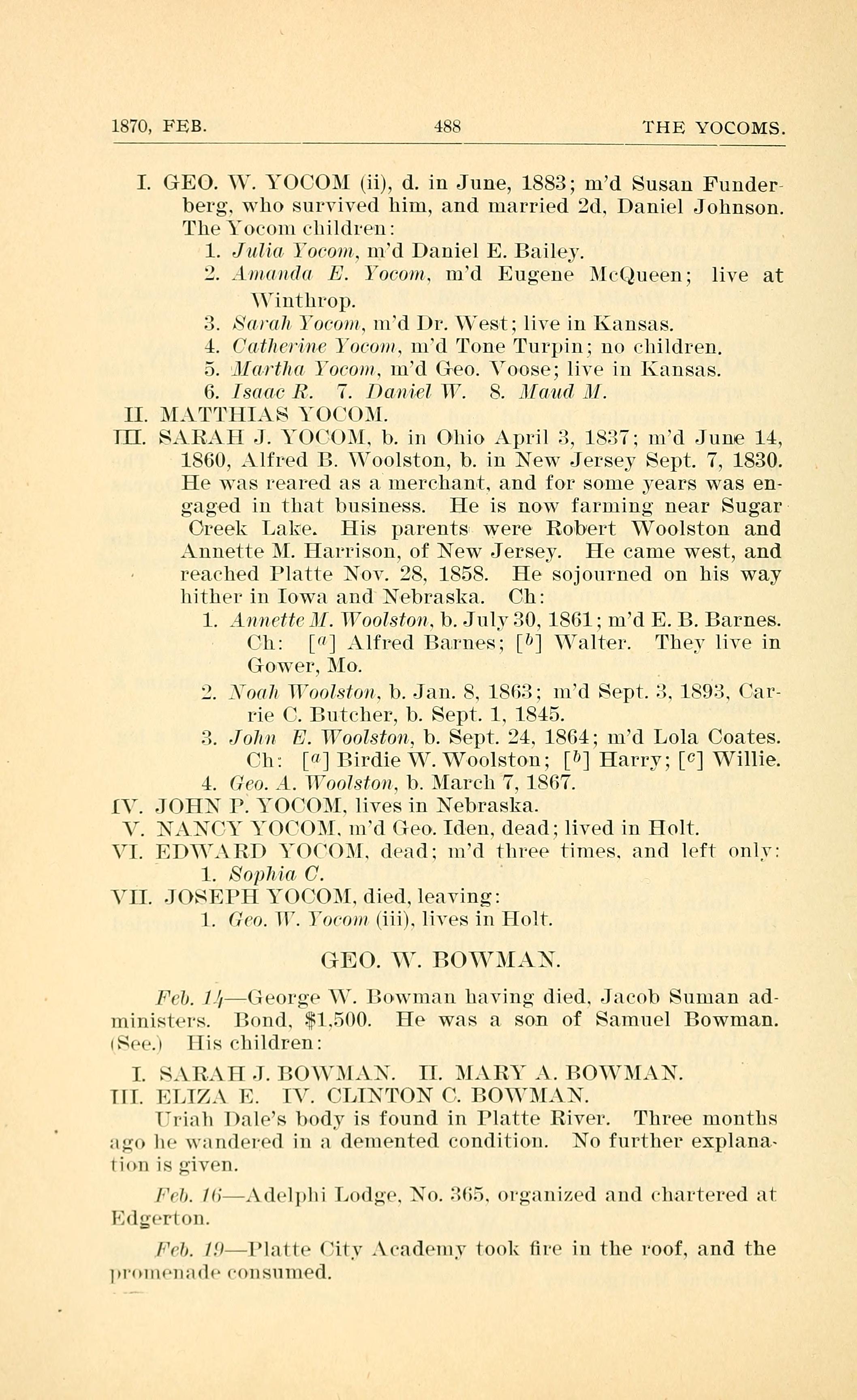 III. SARAH J. YOCUM, married Alfred B. Woolston, farming near Sugar Creek Lake