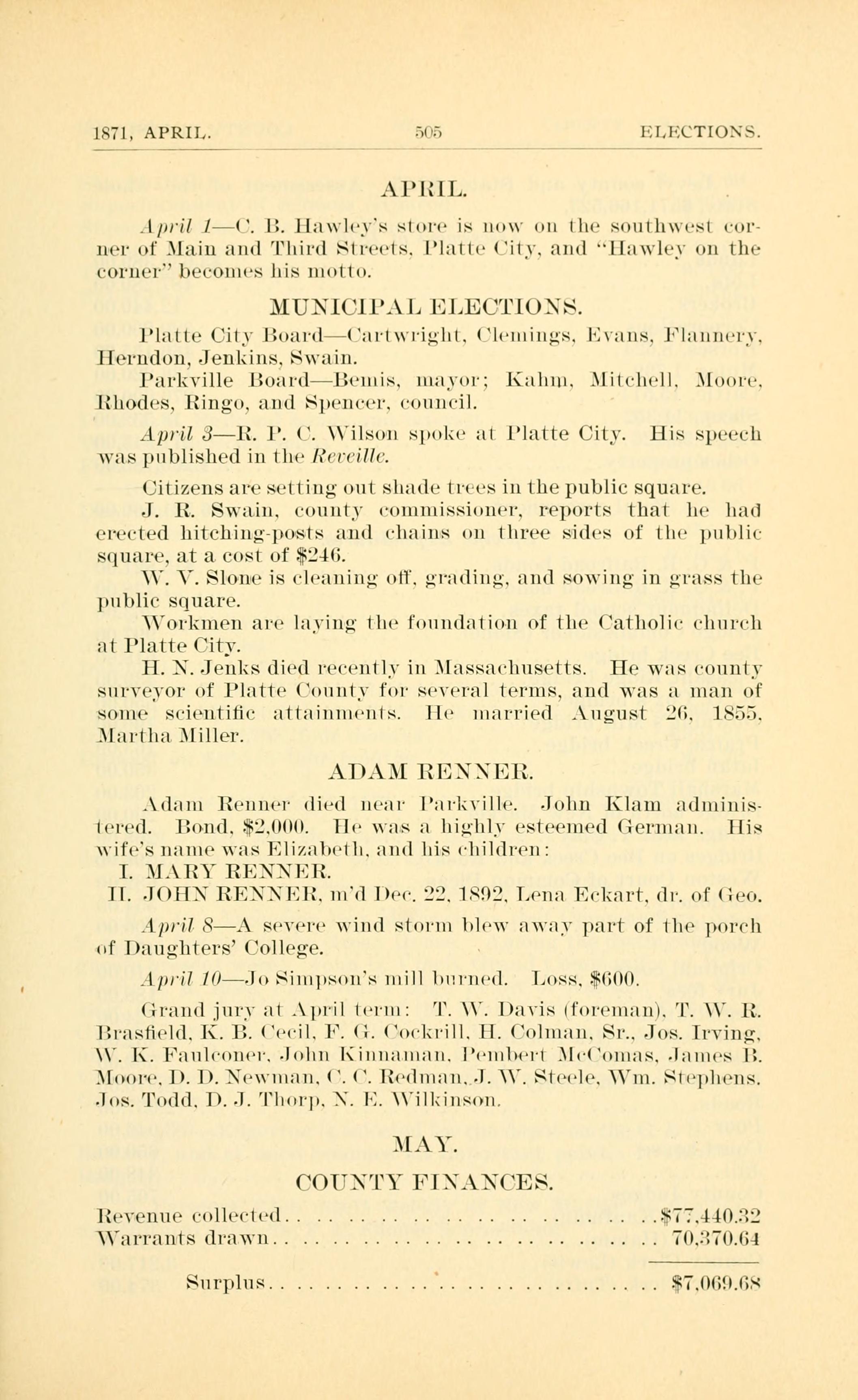 H. N. Jenks died recently in Massachusetts. He was county surveyor of Platte County for several terms, and was a man of some scientific attainments. He married August 26, 1855, Martha Miller.